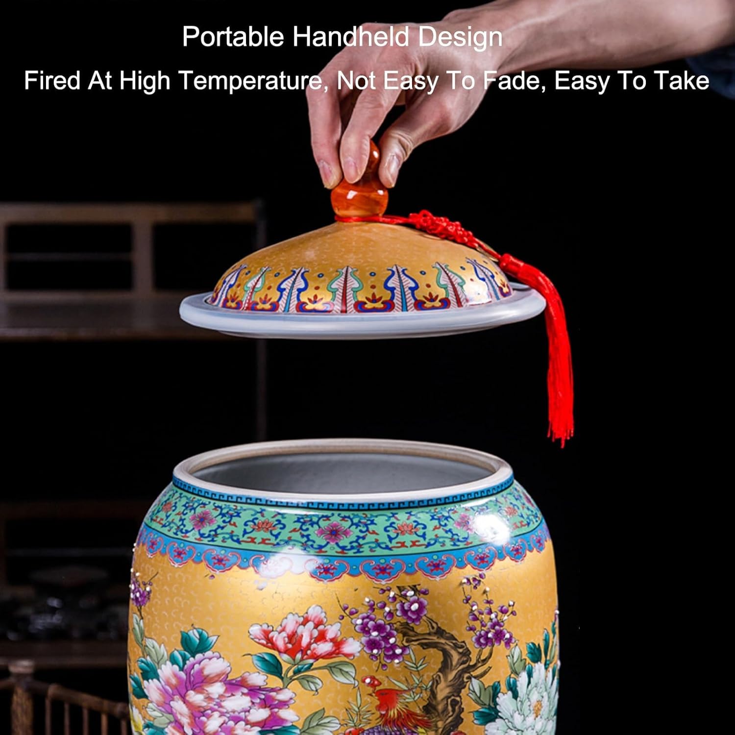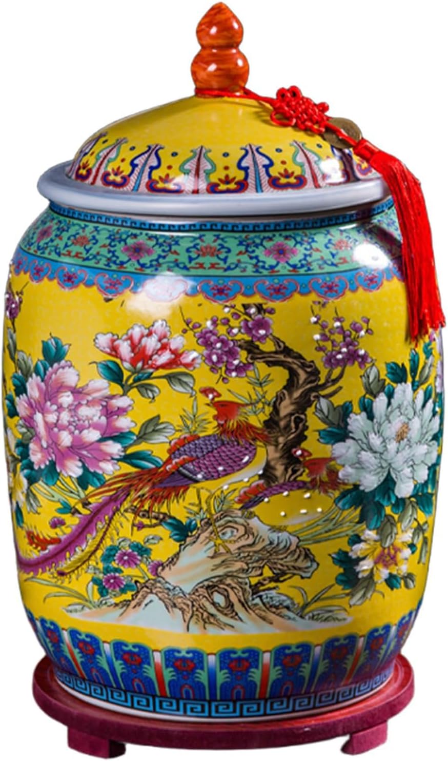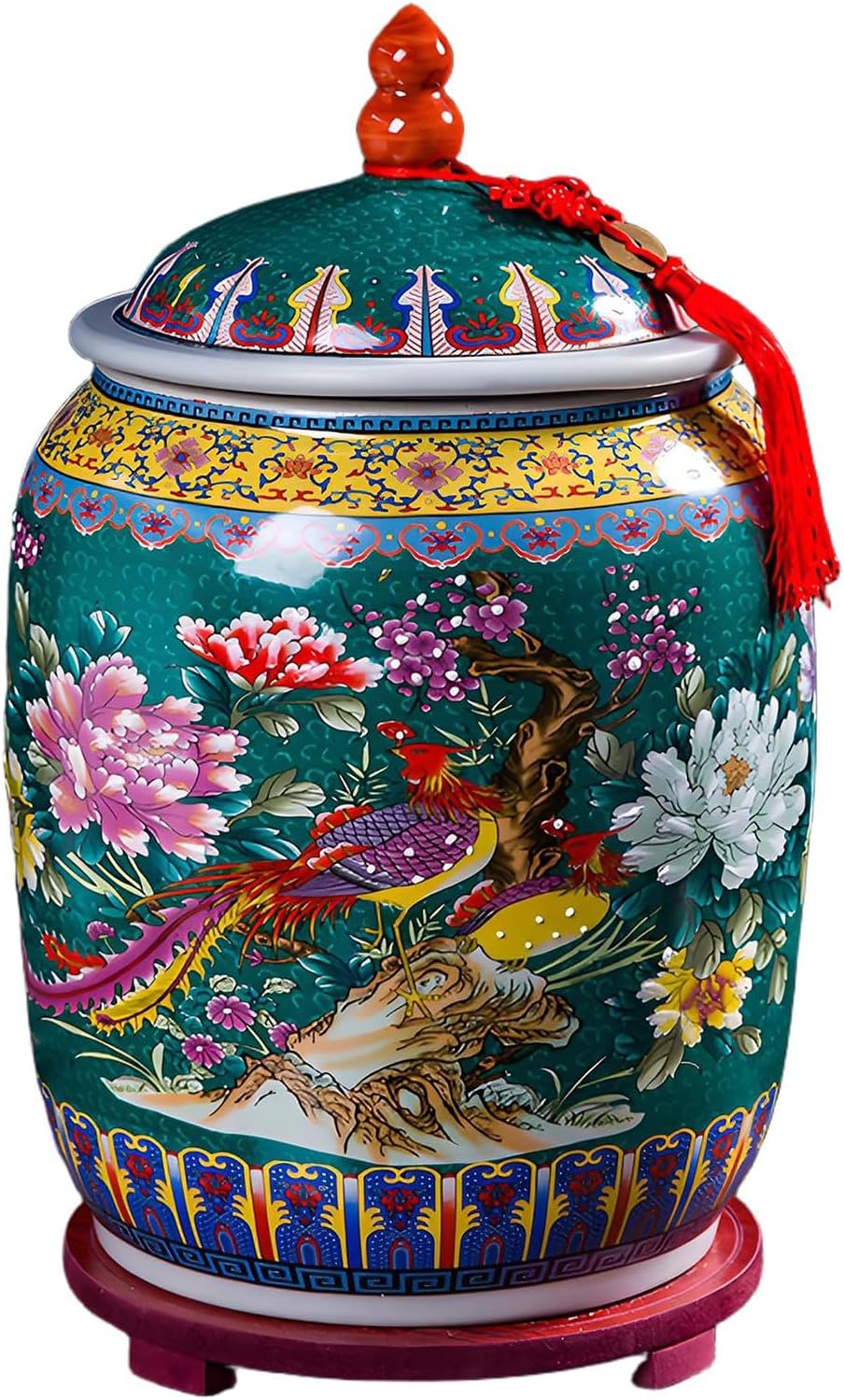 Ceramic Rice Storage JarThis decorative ceramic rice jar features a high-temperature glaze, a tight-sealing lid with a sealing ring, and classic Chinese patterns. Ideal for storing rice, grains, and dry foods, it keeps ingredients fresh, organized, and stylishly displayed in your kitchen, café, or shop.Specifications: Product Name: Ceramic Rice Bucket Material: Ceramic Style: Traditional Chinese Color Options: Red, Yellow, Green, Gold Available Sizes & Capacities: 13" H × 8.1" D (33 × 20.5 cm) – Holds 5 kg 16.5" H × 10" D (42 × 25.5 cm) – Holds 10 kg 18.5" H × 10.8" D (47 × 27.5 cm) – Holds 15 kg 21.3" H × 13" D (54 × 33 cm) – Holds 25 kg Suitable For: Kitchen, pantry, café, restaurant, grocery store, home decorPackage Includes: 1 x Ceramic Rice Jar1 x Measuring Cup1 x Sealing Ring1 x Wooden Base