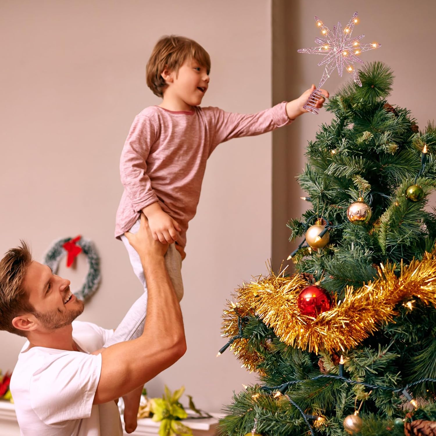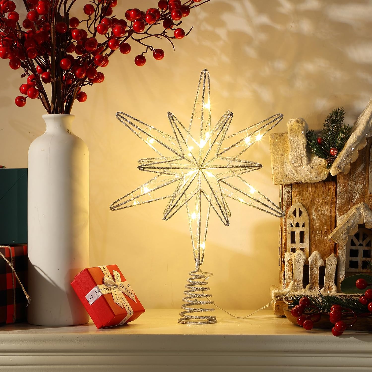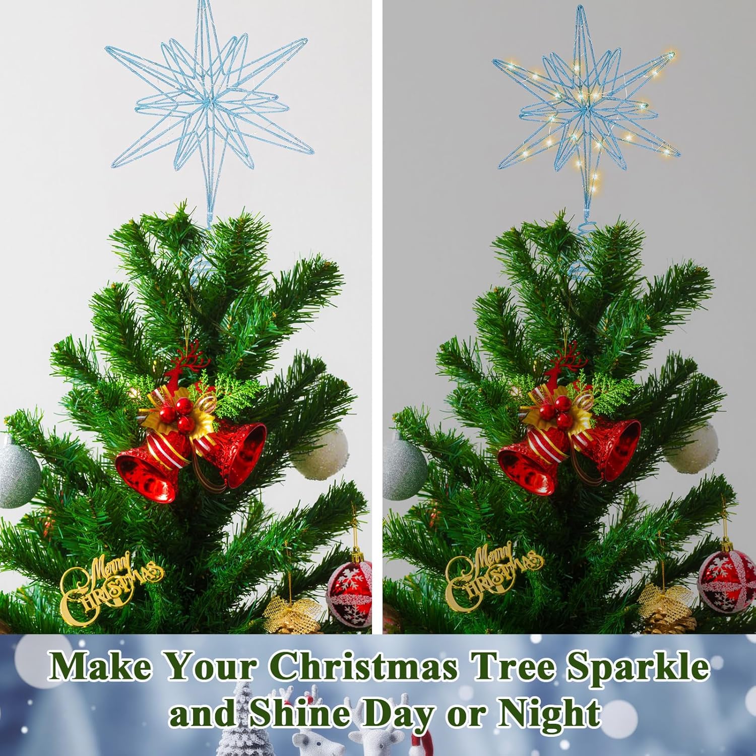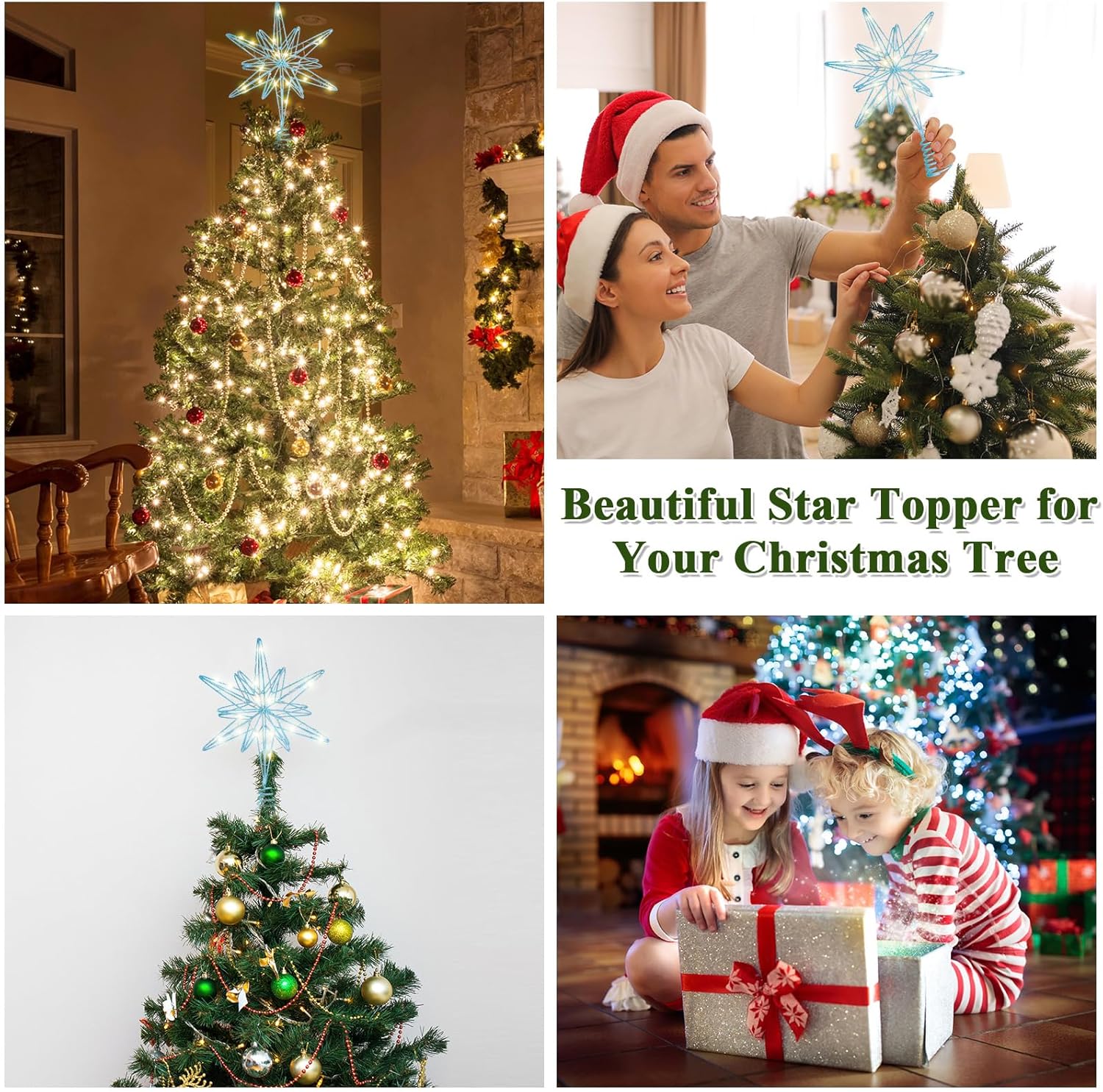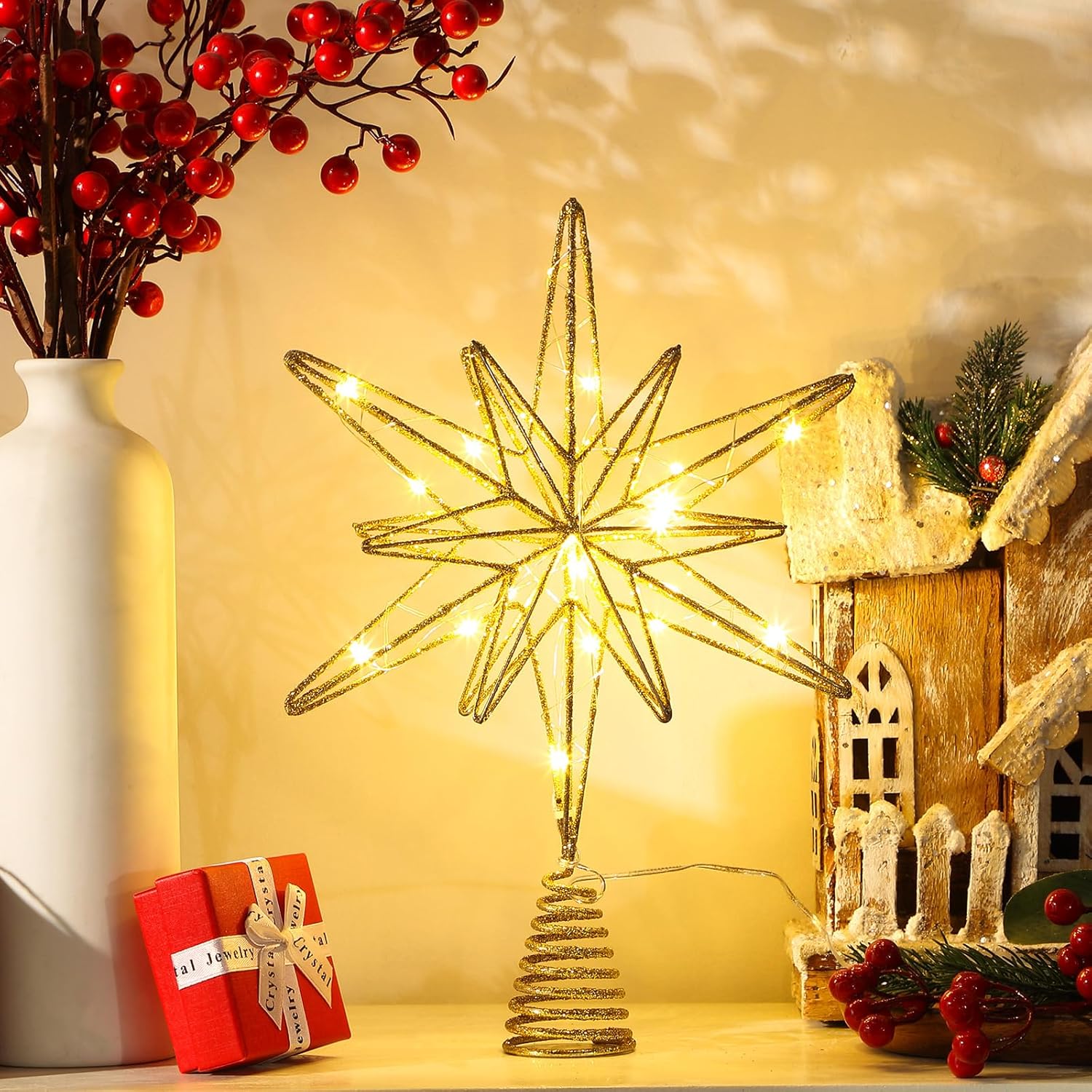 Features: Beautiful decoration for the holidays: Our Xmas star treetop is an exquisite decor to your home, living room, bedroom, fireplace, office, and farmhouse. And light up your Christmas, wedding, party, new year, holiday, creating a beautiful look for your Christmas tree. Ideal Christmas gift: The Christmas tree decorations are suitable for Christmas gifts, symbolizing the star of Bethlehem, to bring love and hope to your family and friends, making them have a new year full of luck and joy. Specifications: Color: main champagne Material: main metal Size: 12.5 x 9.8 inches (H x W) Package includes: 1 x Lighted Christmas star tree topper Notes: Manual measurement, please allow slight errors on size. The color may exist slight difference due to different screen display.