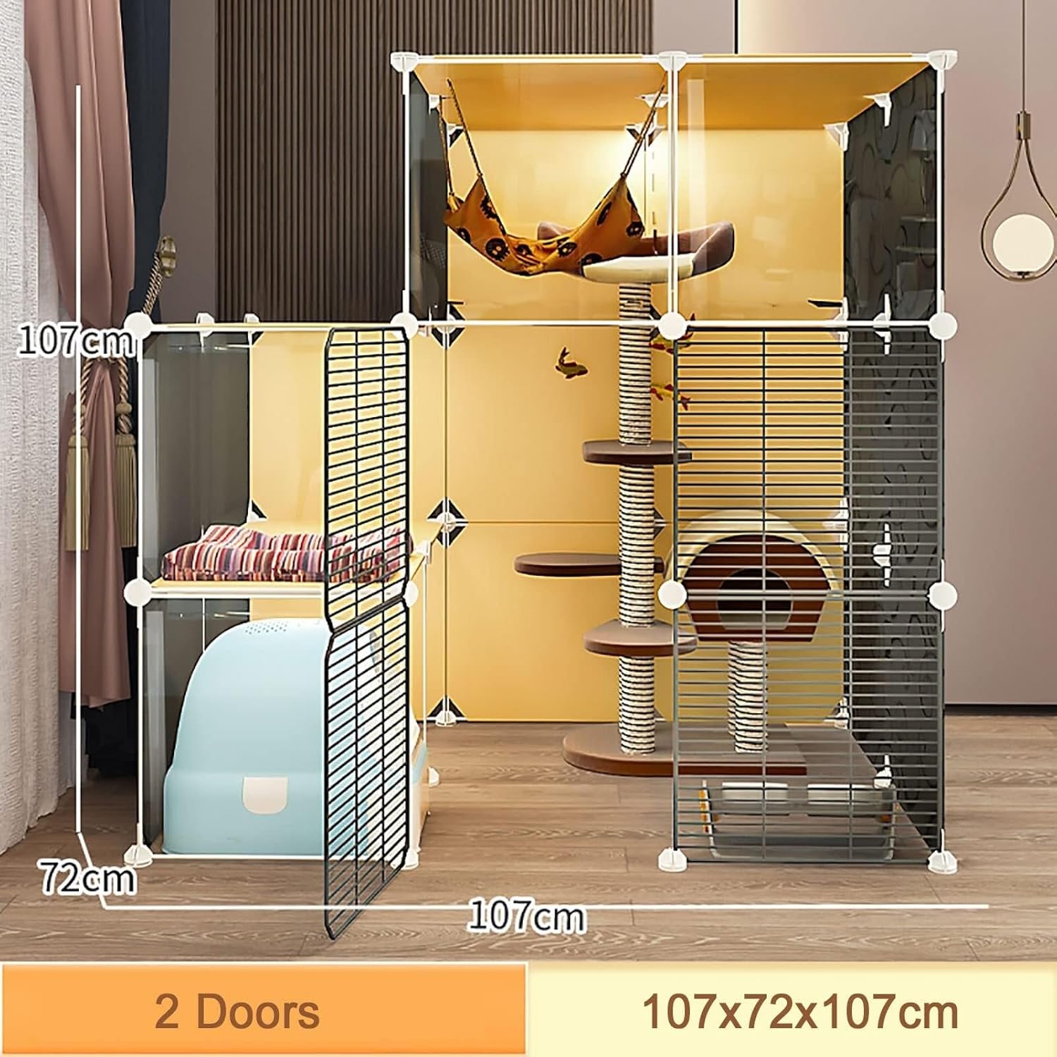 This large indoor cat cage is designed to provide a safe, spacious, and comfortable environment for your cats to play, relax, and exercise. Constructed from durable, rust-resistant metal, it ensures long-lasting use and safety for your furry friends. The spacious interior provides ample room for up to three cats to climb, explore, and stay active.Equipped with multiple easy-access doors, the cage allows you to feed your pets, clean the litter box, or spend time playing with them effortlessly. The detachable design ensures quick assembly and disassembly, making it easy to transport or store when needed.Perfect for homes with limited space, this cat cage combines functionality and convenience, providing your pets with a cozy habitat while keeping your living area neat and organized. The package also includes essential accessories like a cat ladder, nest, hammock, bowl, and litter box to enhance your cat's comfort and play experience.Product name: DIY Cat Cage cat cage color: yellowMaterial: metalPacking list:1x Cat cage 1x Cat ladder1x Cat nest1x Cat hammock1x Cat bowl1x Cat litter boxNote: The accessories of this product are for reference only, the Free accessories will be subject to the actual product received, thank you for your understanding