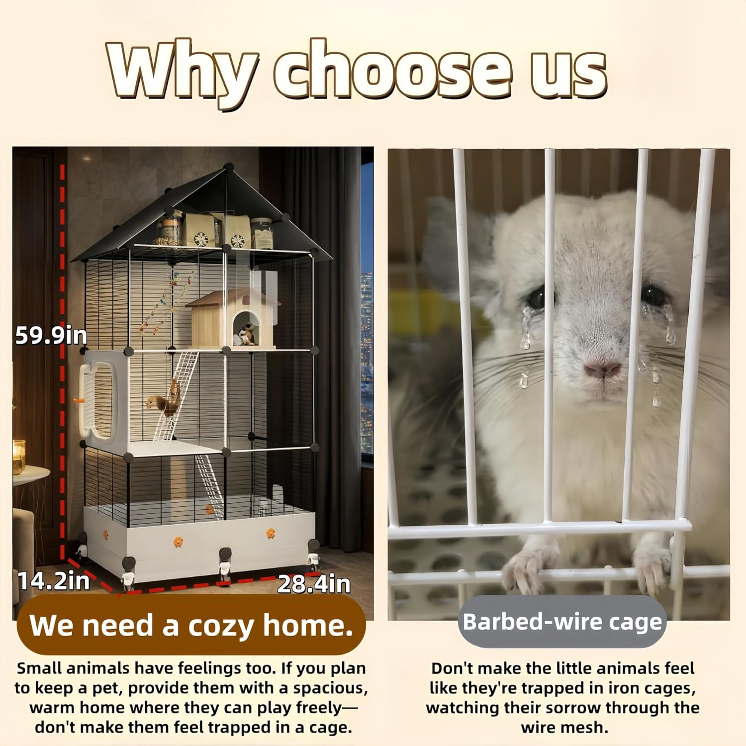 Multi-level cage: Suitable for various small pets, providing ample space for activity. Bonus set: Each item comes with an automatic water dispenser and platform mat. Splash-proof design: Effectively keeps the area clean. No more messes from your little pet everywhere. Transparent design: Clearly see your pet's every mood. No more peering through wire mesh to watch your little friend. Drawer-Style Cleaning: Features a pull-out tray for effortless cleanup—simply slide out the tray to empty waste. Wheel Design: Easily relocate outdoors or reposition during room cleaning. Adjustable Mesh Base: Customize grid density for different pets with DIY installation. Fine Mesh Gaps: Effectively prevents escapes or injuries. Convenient Cleaning System: Streamlines pet care routines and maintains a tidy environment. Waste falls directly into the drawer tray for easy removal and thorough cleaning. Storage Capability: Accommodates daily essentials for small animals. If you cherish your pets, create a spacious home for them. Let them move freely without constraints and help them live happily.