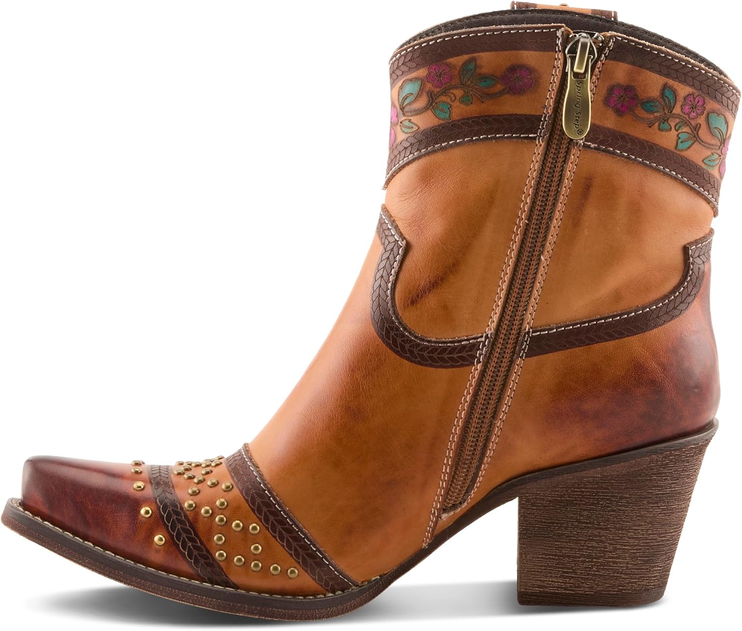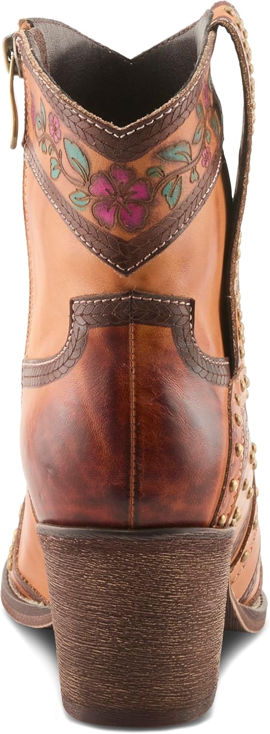 Embrace your inner cowgirl with the L’Artiste SADDLEUP boot—where rugged charm meets artistic expression. Crafted from premium leather, this Western-inspired mid-calf boot features hand-embossed floral panels, contrast stitching, and edgy stud accents. A pointed toe adds attitude, while the faux stacked block heel provides height without compromising comfort. With a smooth side zipper for effortless entry and a cushioned insole for supportive wear, SADDLEUP is the perfect blend of fashion and function. Pair with denim or dresses to create your signature frontier flair.