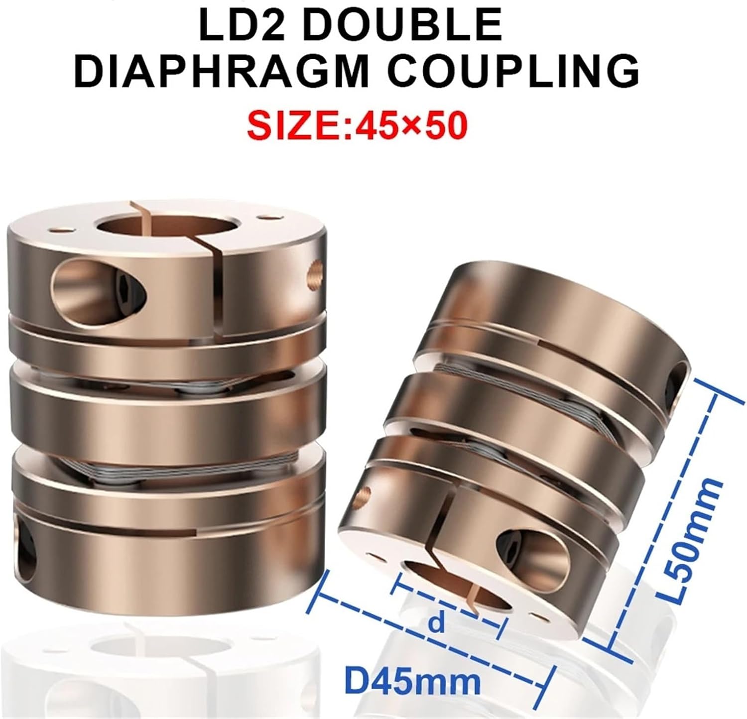CouplingsStandard or Nonstandard : StandardFlexible or Rigid : FlexibleModel Number : LD2-B-D45L50 CNC Shaft couplerMaterial : AluminiumStructure : discInstallation : set screw / clampMaterial of Disc : SUS304 stainless steelFeature 1 : hard anodizingFeature 2 : Zero BacklashFeature 3 : Integrated structureFit for : For servomotor/stepmotor
