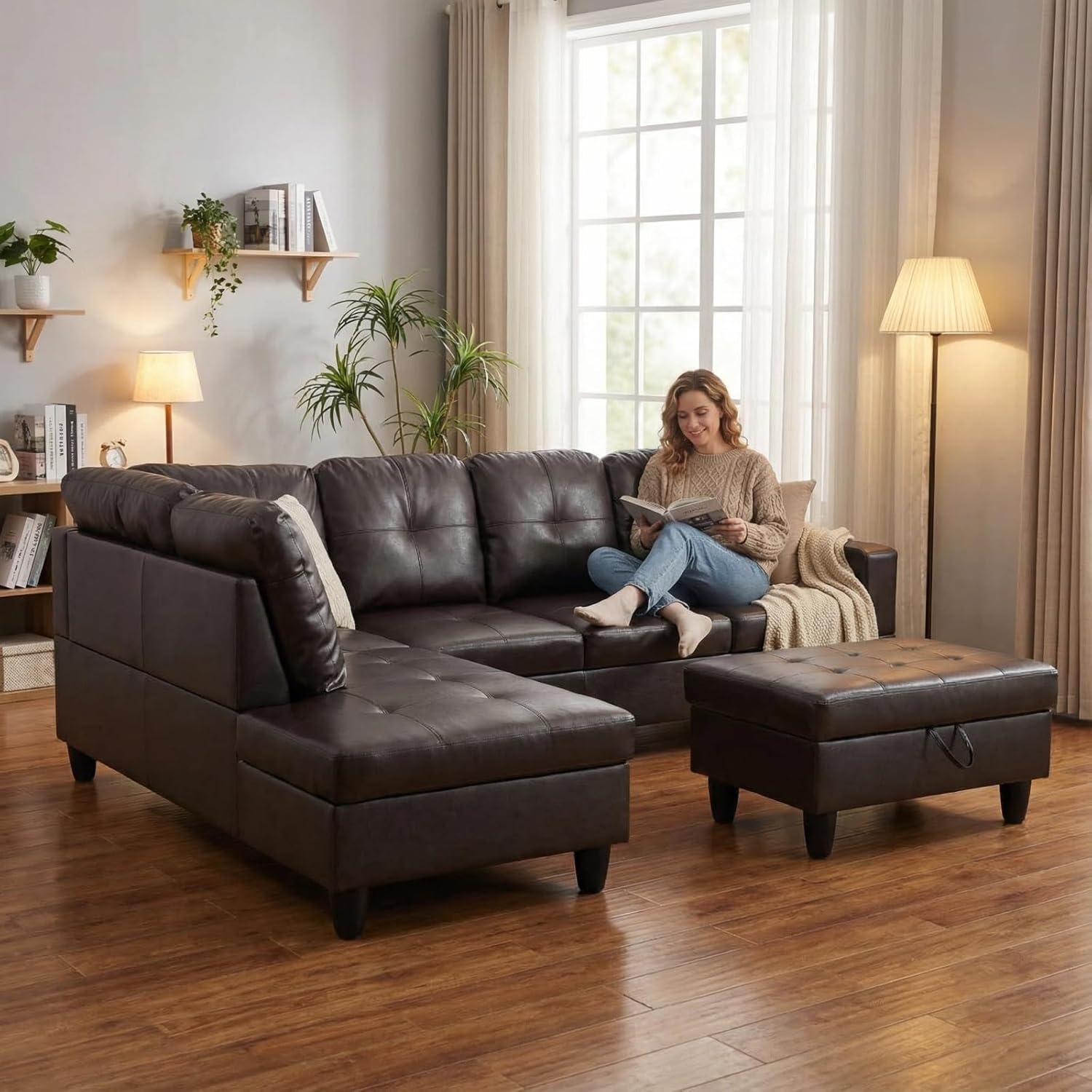 Trygoal Leather Sectional Couch, L-Shape Sofa with Storage Ottoman, Modern 3-Piece Sofa Set for Living Room, Contemporary Upholstered Couch Set with Solid Wood Frame for Apartment, Loft, Brown