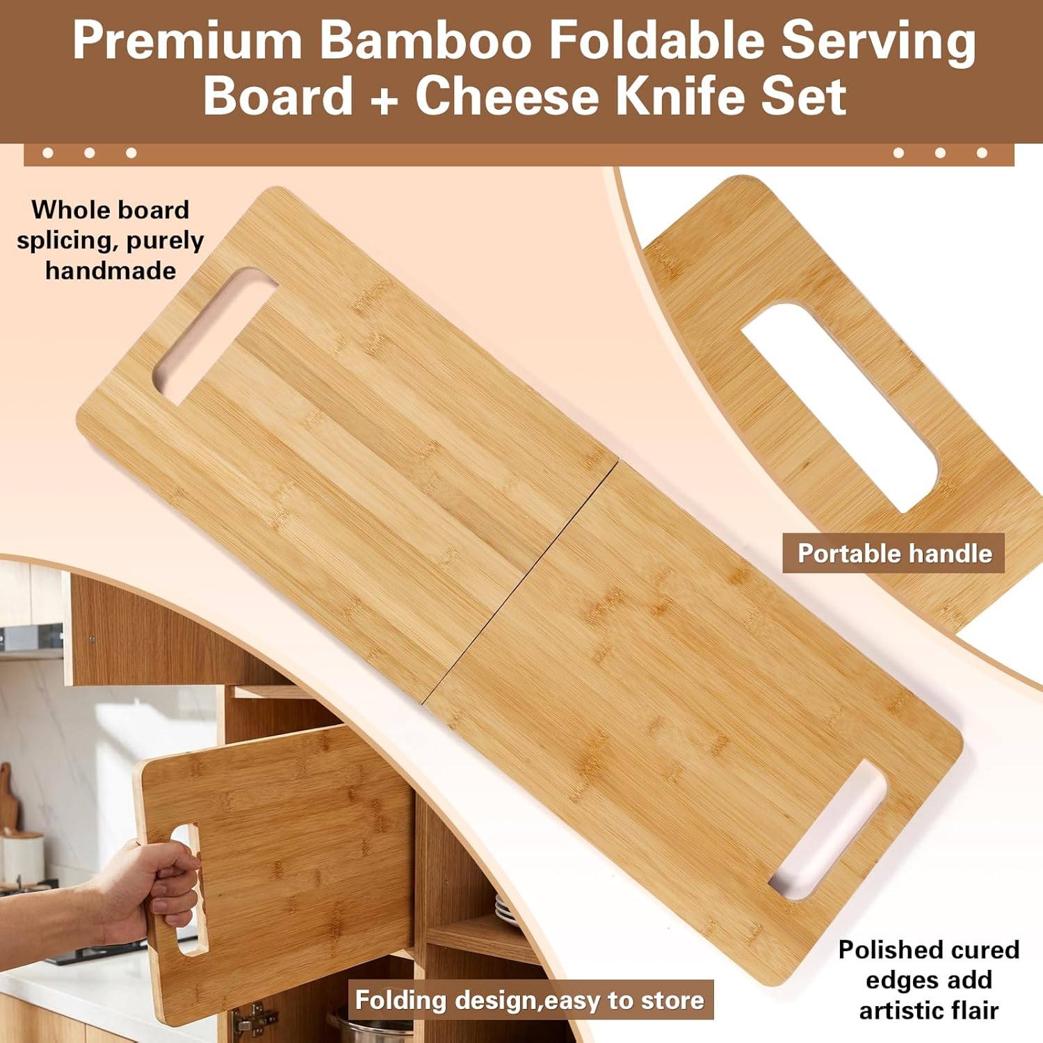 Features: Portable and Convenient Design: Transport your delicious creations effortlessly with the foldable charcuterie board with handles. The built-in handle ensures easy carrying, transforming this practical bamboo cutting board into a convenient large cheese board that caters to spontaneous snacks and planned events alike. The good Gift for Hosts: Surprise your loved ones with a gift that marries beauty and utility. This large foldable charcuterie board, with its foldable large charcuterie boards design and quality build, is a desirable hosting partner for anyone who appreciates fine dining and home entertaining. Specifications: Material: solid bamboo Color: brown Size: Expanded size: 33 x 12 x 0.6 inches Folding size: 17 x 12 x 1.2 inches Package includes: 1 x Large foldable charcuterie board 3 x Cheese knives 1 x Knife stand Notes: Manual measurement, please allow slight errors on size. The color may exist a slight difference due to different screen displays