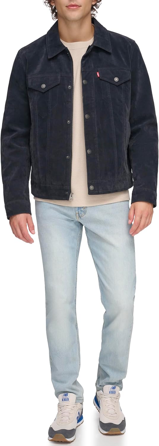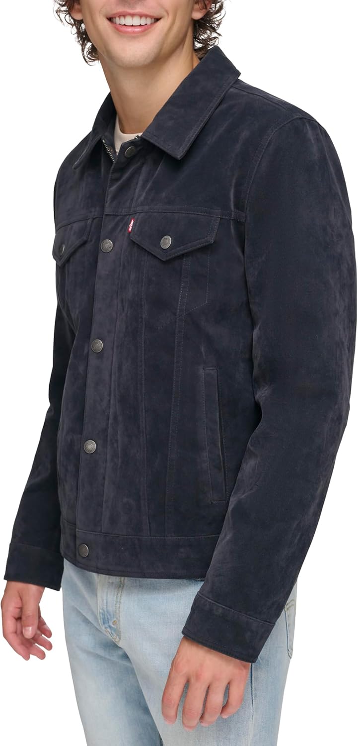 Smooth lamb touch faux leather laydown collar classic trucker jacket. Fly front placket with dual closure zipper and snap