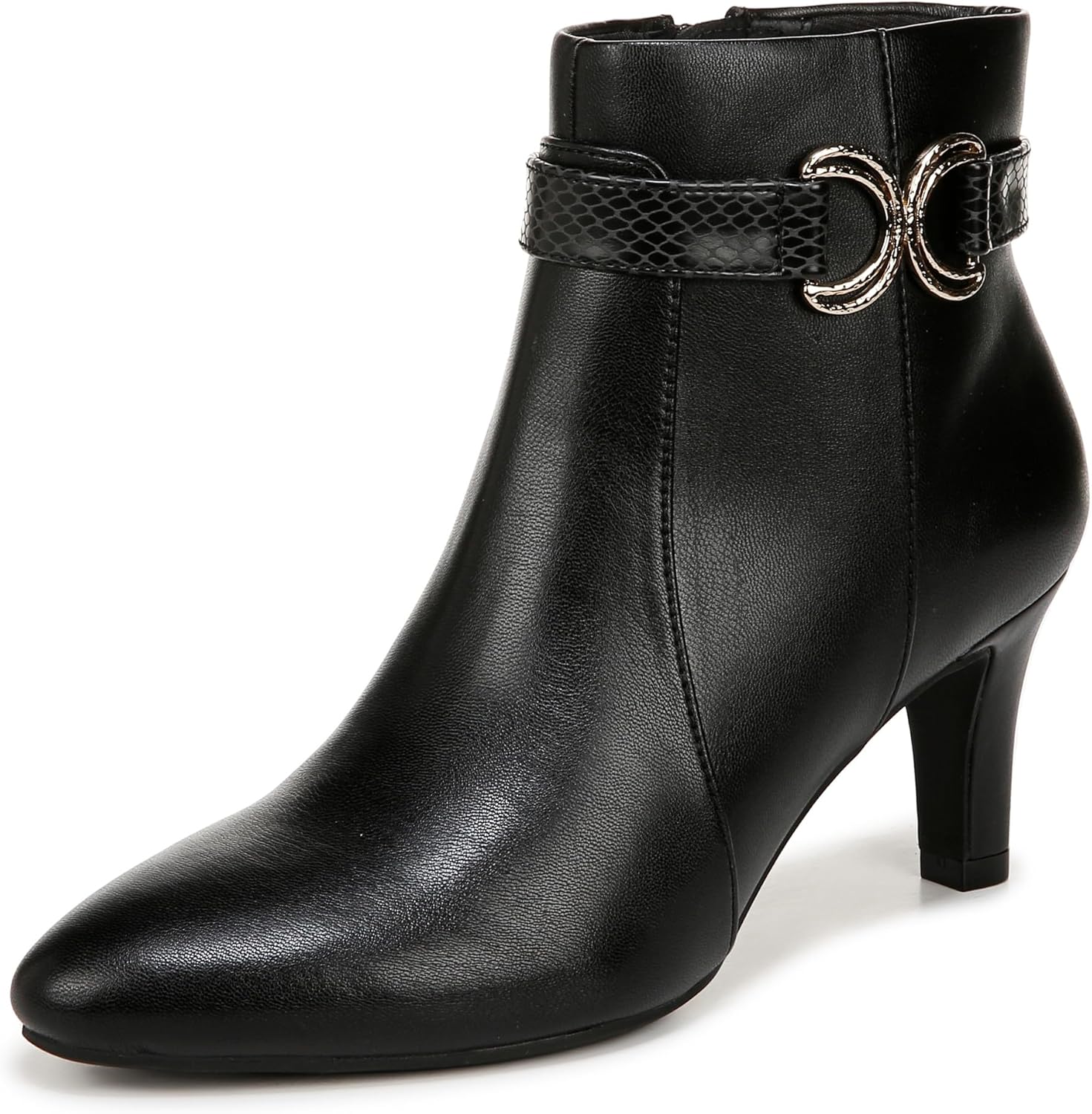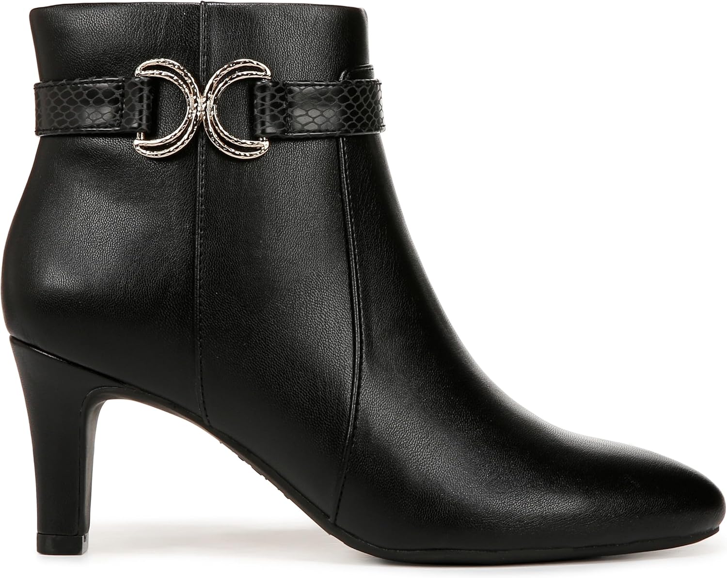 So sleek and chic, you’ll never want to take off this heeled dress bootie with a sophisticated metallic detail. Faux leather upper with an almond toe, inside zip, metallic buckle ornamentation, and embossed strap detail. Linings, insole board, toe box and heel counter crafted with partially recycled materials. Soft System® comfort package provides all-day support, flex, and cushioning. Traction sole provides you with extra stability. Just Right Height 2 3/4 inch heel.