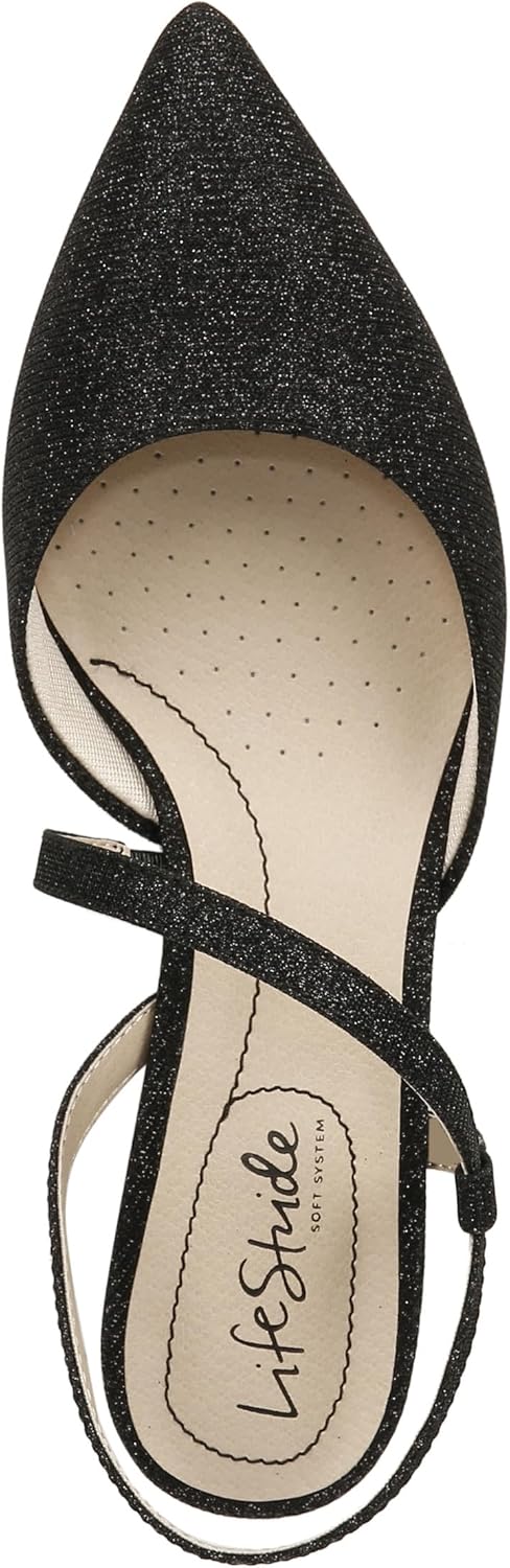 The seasonless staple. Top off any look with these gorgeous, perfectly pointed women's heels. Kitten heel pumps designed with a faux leather or fabric upper, pointed toe, slip-on fit, and asymmetrical strap with built-in stretch. Trusted Soft System® comfort technology for unmatched cushion, support, and flexibility in every pair. Traction sole provides you with extra stability. Just Right Height 1 5/8 inch heel.