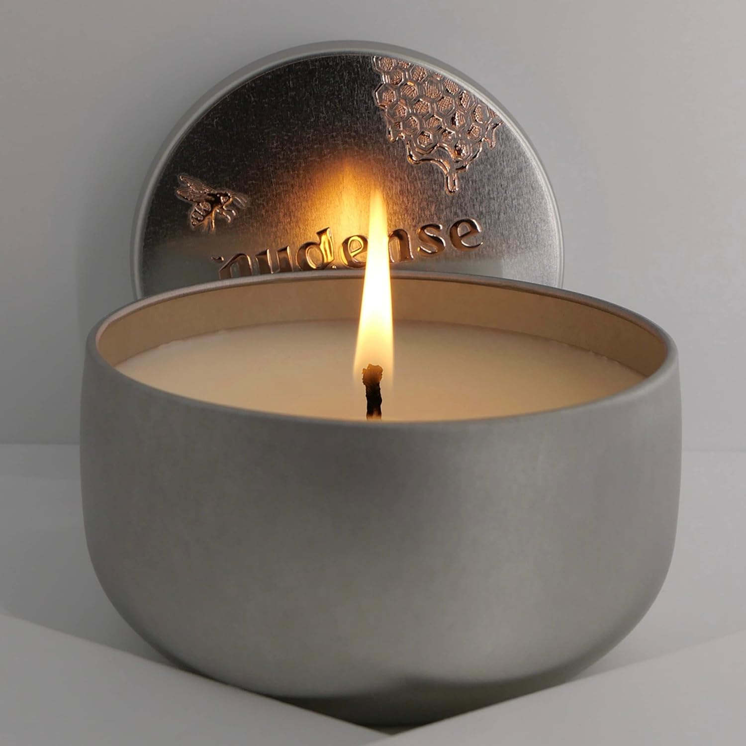 NUDENSE LIMITED EDITION HOLIDAY GIFT SET contains three signature holiday scented candles and one unscented candle: SCENT NAME: spiced orange slices INGREDIENTS: organic coconut oil, 100% pure beeswax, 100% pure sweet orange essential oil, 100% pure cinnamon leaf essential oil SCENT: freshly-squeezed orange and open jar of ground cinnamon PRODUCT DETAILS: “gold” metal tin with embossed metallic "red" label SCENT NAME: frosted vanilla bean INGREDIENTS: organic coconut oil, 100% pure beeswax, 100% pure vanilla oleoresin essential oil, 100% pure peppermint essential oil SCENT: peppermint candy PRODUCT DETAILS: “wine” metal tin with embossed metallic "silver" label SCENT NAME: snug siberian fir INGREDIENTS: organic coconut oil, 100% pure beeswax, 100% pure vanilla oleoresin essential oil, 100% pure fir needle essential oil SCENT: Christmas tree + freshly baked sugar cookies PRODUCT DETAILS: “white” metal tin with embossed metallic "green" label SCENT NAME: whipped honey butter INGREDIENTS: organic coconut oil, 100% pure beeswax SCENT: natural coconut + honey PRODUCT DETAILS: “silver” metal tin with embossed metallic "rose gold" label NUDENSE candles contain 3 simple, high-quality ingredients: 100% pure beeswax 100% pure essential oils (if scented) certified organic extra-virgin coconut oil free of anything unkind to you: phthalates, sulfates, parabens, lead, soy, gluten, fillers, paraffin, synthetic fragrances, petroleum, etc. our thick cotton wicks are coated in 100% pure beeswax for the optimal burning experience each candle is handmade from pouring to labeling to packaging due to the handmade nature of this item, imperfections are avowed