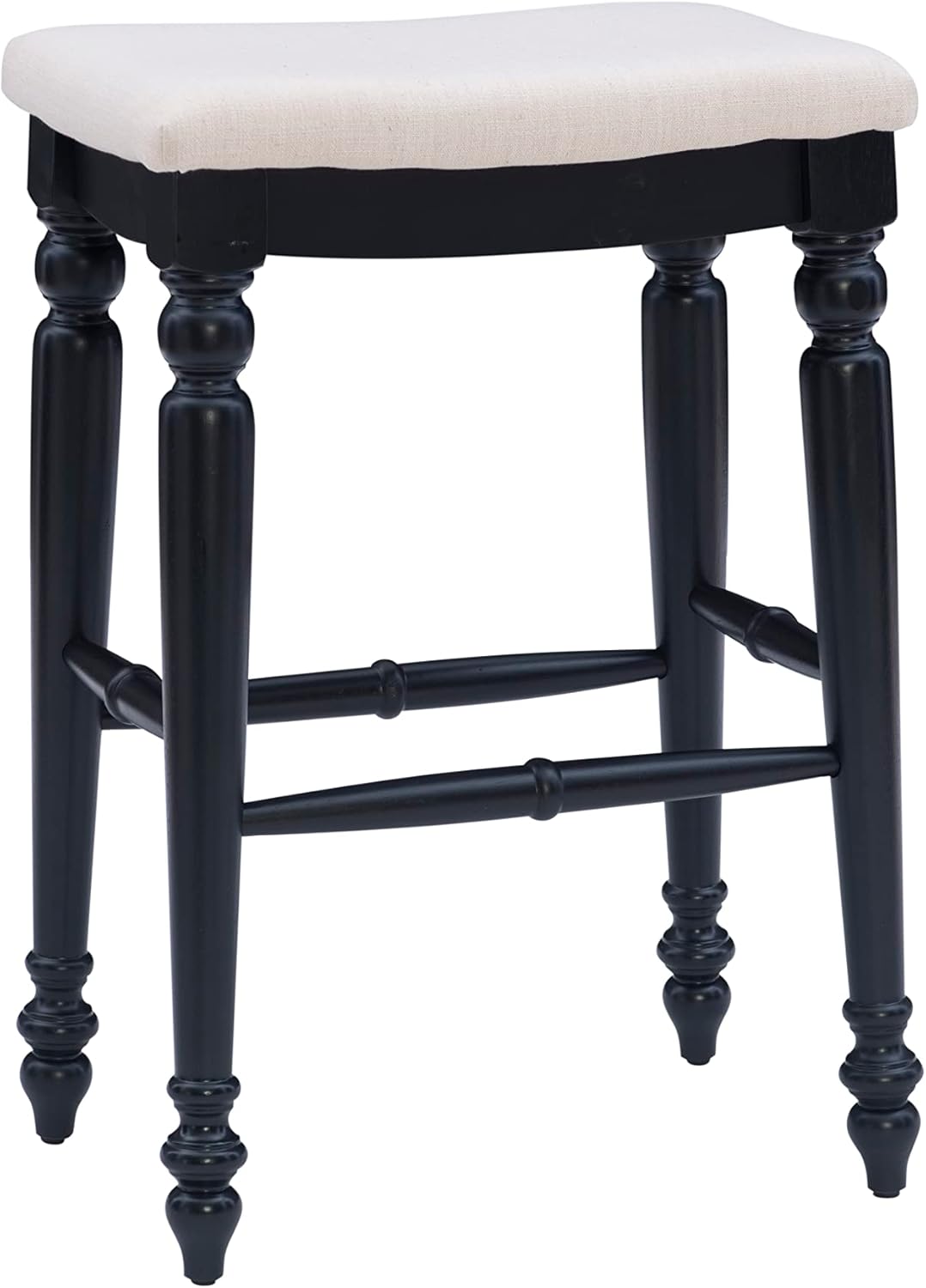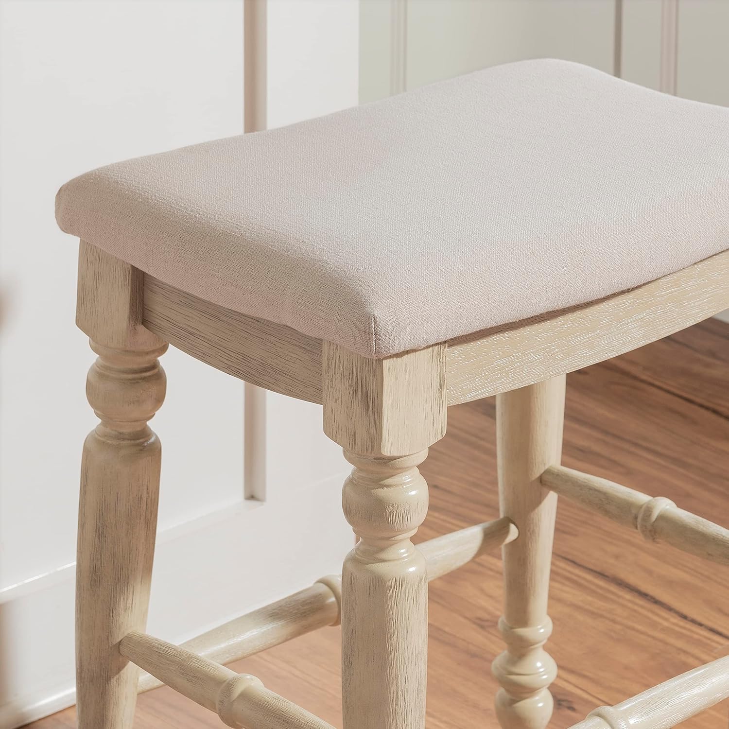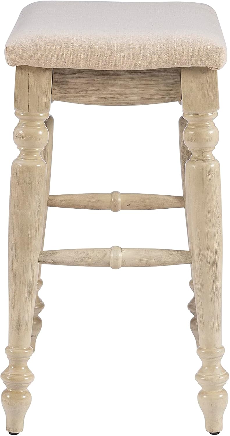 Unique and stylish, the Joanna Backless Counter Stool will add eye-catching design to your kitchen counter or high top table. The backless stool features elegant turned legs and a plush curved seat. The neutral padded seat easily complements the white wash finish. Counter Height.