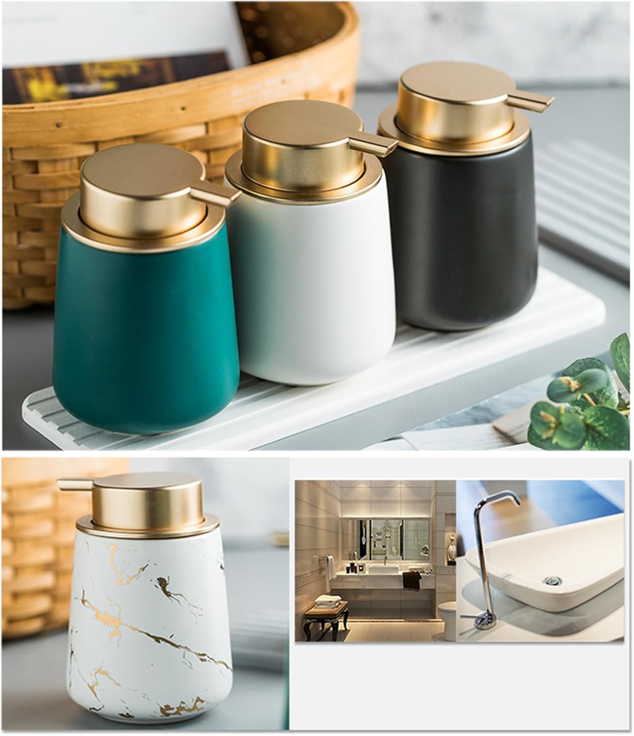 Liquid Soap Shampoo Lotion Shower Gel Ceramic Empty Bottle Container Bathroom Portable Soap Dispensers Subbottle 2xFeatures:This ceramic soap dispenser set is a addition to your bathroom decor with its elegant and moderndesign high qualitys ceramic this soap dispenser set is and rust with a matte metal head.Suitable for all age, this soap dispenser set is for home bathrooms and highends hotels.This soap dispenser set is for storing liquid soaps and lotions in your bathroom.The gold marble pattern on the ceramic add a touch of luxuryto your bathroom decor.Specifications:Ceramic Size Approx.12.5x8.5cm 4.92x3.34inch Color White Black Dark GreenCapacity:400mlPackage Includes:2x Soap DispenserNote:①.Please allow 1-2cm errors due to manual measurement, make sure that you do not mind before you order. ②.Due to the difference between different monitors, the picture may not reflect the actual color of the item.Thanks for your understandings.