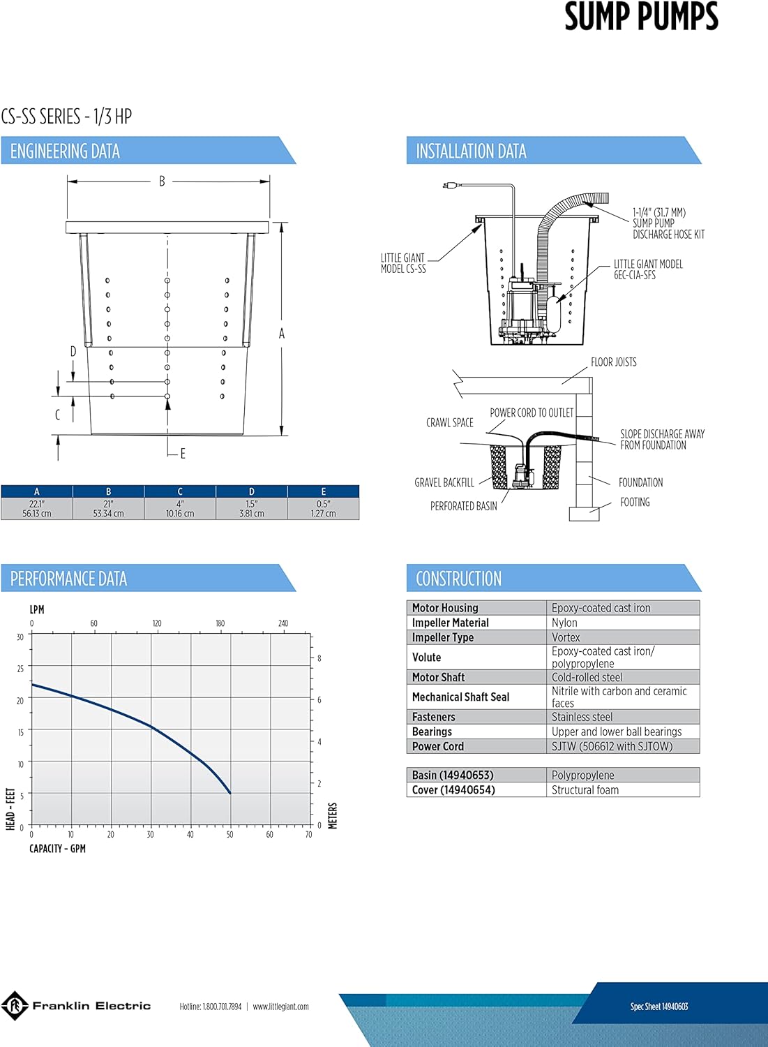 The Little Giant CS-SS Crawl Space Sump Pump System is designed for use in residential low-lying areas such as crawl spaces or homes with shallow sump pits. Removing moisture from these areas aids in the prevention of mold and fungus, as well as moisture damage to floors, insulation, and metal ductwork. Moisture removal also helps minimize potential structural damage caused by freezing water. The CS-SS sump pump system can also be used to help prevent water from standing in low-lying problem areas such as a yard, patio, driveway, and more. Includes an automatic 115 Volt, 1/3 HP, 3000 GPH cast iron pump, hose kit, basin, lid, and check valve. Pump comes with a 20-ft. cord.