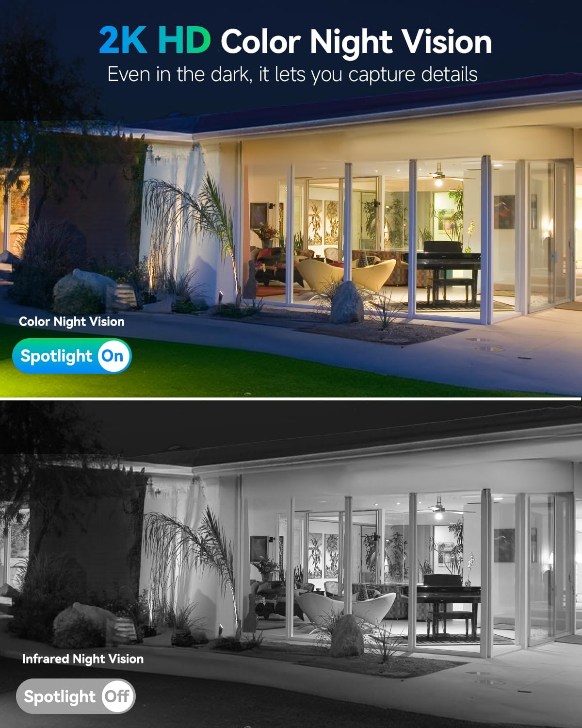 • See Everything in 2K HD: Never miss a detail with 2K resolution and full-color night vision. As outdoor cameras for home security, they offer a 360° field of view, ensuring comprehensive coverage of every corner you care about.