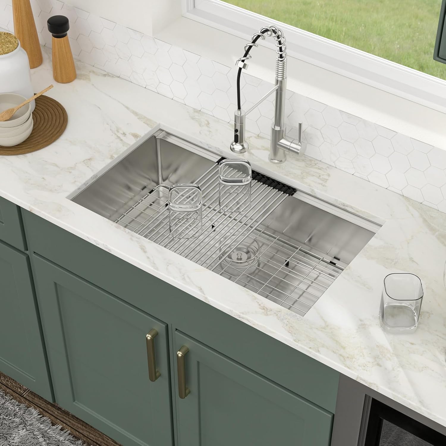 | Included Components | 33 inch undermount sink, Bottom rinse grid & Cutout template, Cutting Board & Colander, Mounting hardware & Installation instruction, Roll-up dish drying rack & Drain assembly |