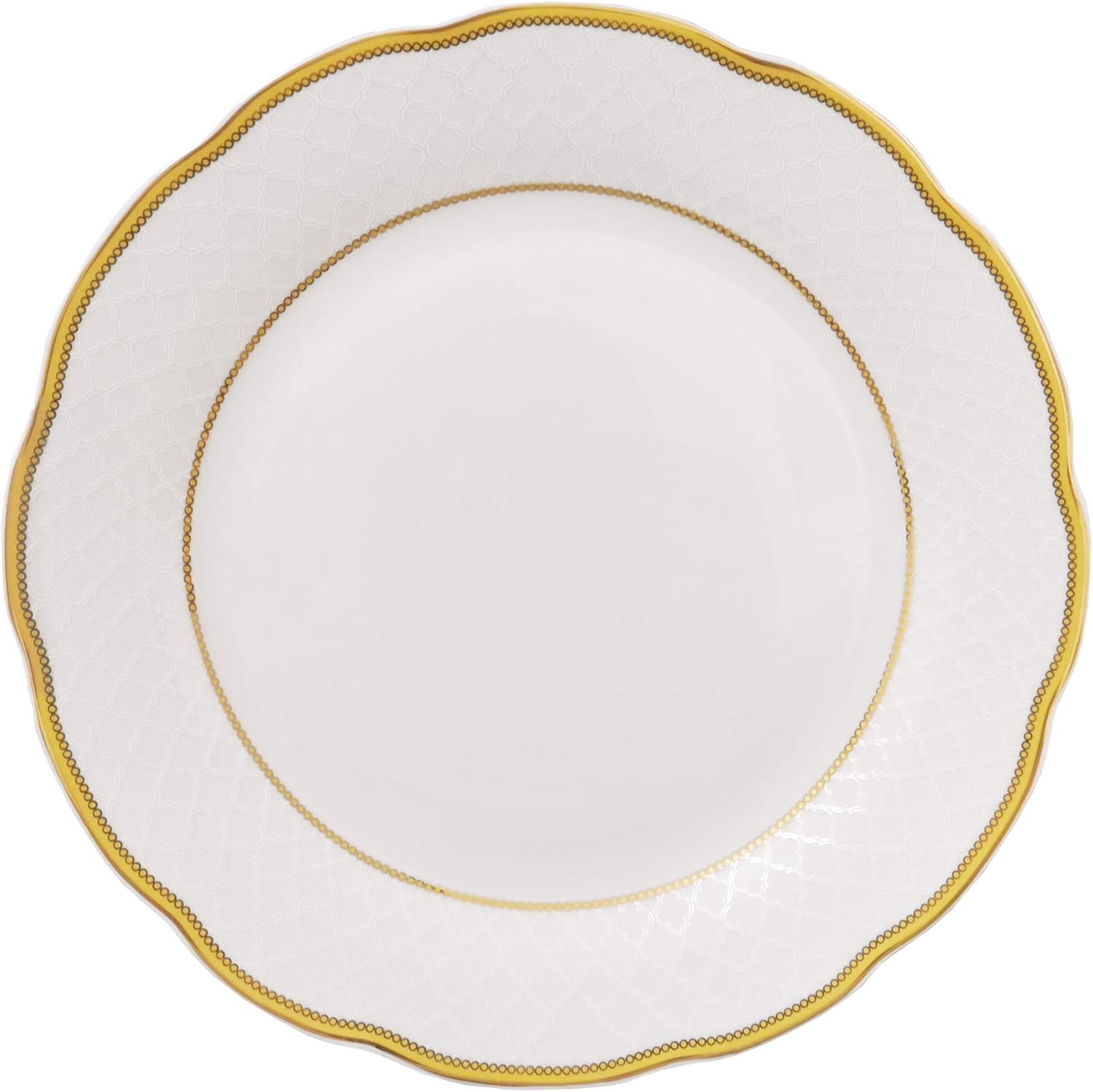 24 Piece Wavy Edge Porcelain lattice design with gold border Dinnerware set, service for 4. Dishwasher safe. Durable porcelain great for everyday use of fine and elegant enough for special occasions. This set comes complete with everything you need to set your table including serving pieces. Set Includes: 4-10.5" Dinner Plates, 4-Soup Bowl, 4-Salad/bread and butter dishes, 4-8oz. Tea Cups, 8-Tea Saucers, 4-Fruit or Dessert bowls. Dishwasher Safe: China Setting.