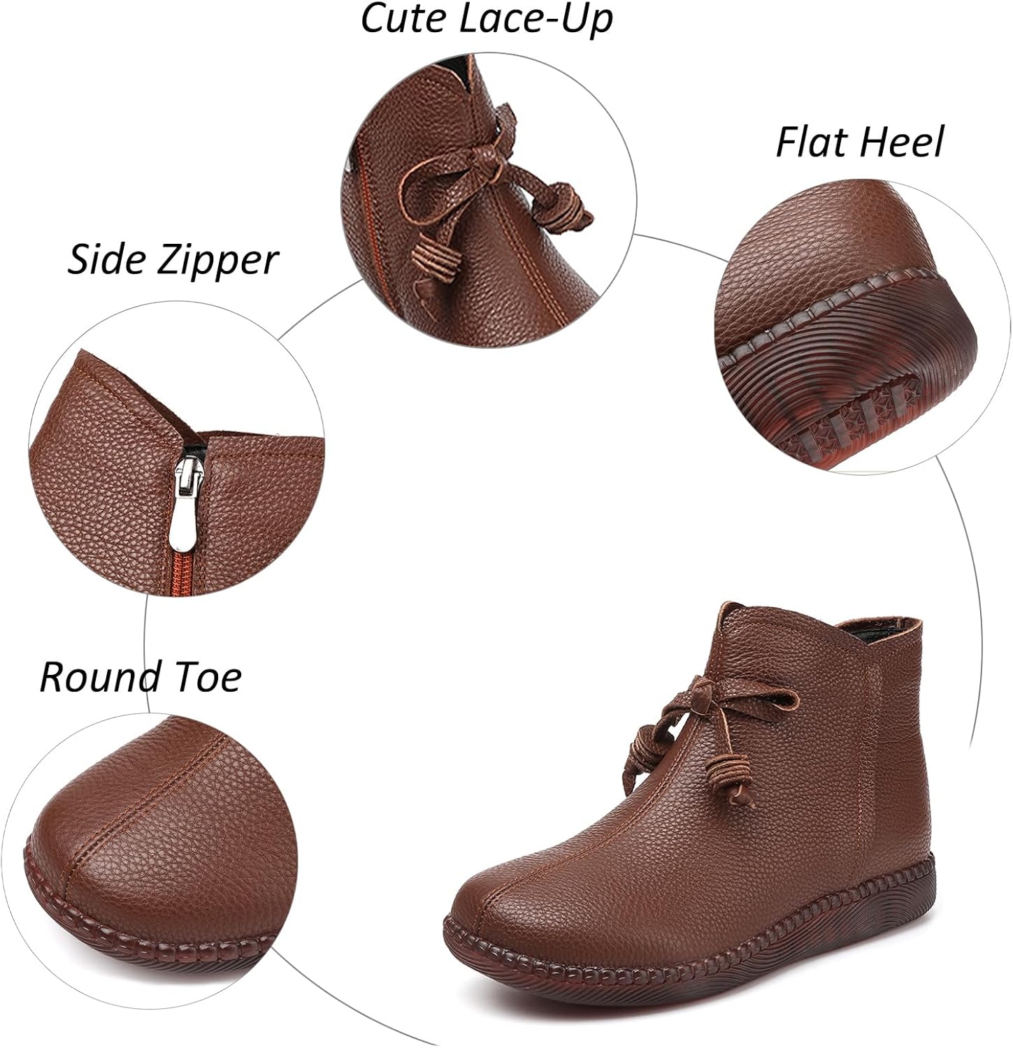 Size: 4.5-11 Colors: Black、Black Plush 、Brown、Brown Plush Closure Method: Side Zipper Style: Fashion/Casual/Dress/Vintage Package Including: A Pair of Women's Leather Side Zipper Soft Flat Ankle Boots Please Note: *Please allow 1- 3cm ( 0.4- 1.18in ) difference due to manual measurement. *Due to the light and screen setting difference, the item's color may be slightly different from the pictures, please refer to the actual product.(Thank you for your understanding!)
