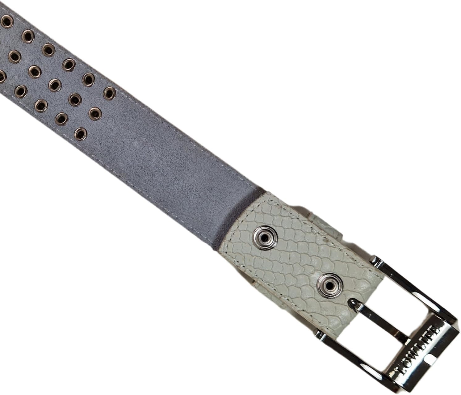 Lowlife Triple S Studded leather belt in white snakeskin features metal eyelets and removeable buckle as well as stitched edge, triple studs and unisex design. Branding includes a Lowlife spin buckle and Lowlife debossed belt loop as well as Lowlife metal badge. Made with chrome metal studs, chrome metal trim. Made from 100% bonded leather and is 3.7cm wide.