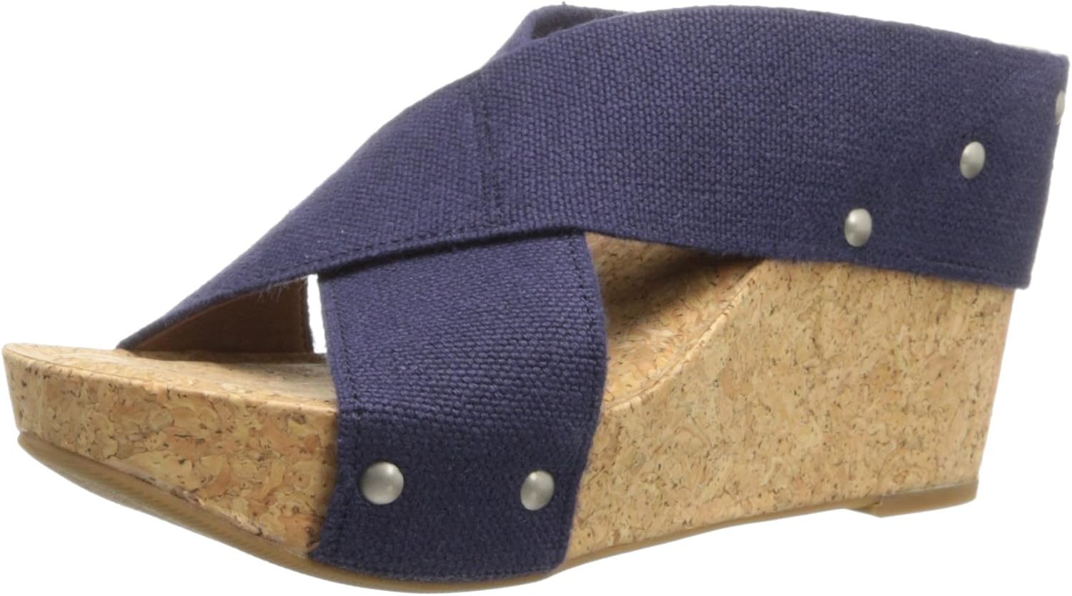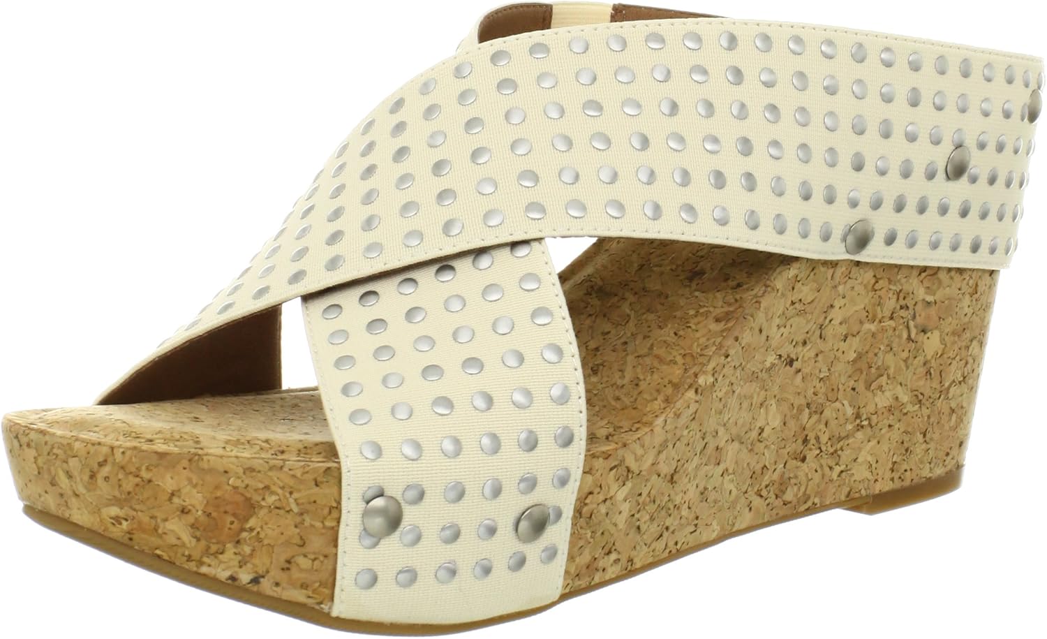 Strut your stuff with the stylish Miller 2 sandals by Lucky Brand. Fabric upper. Fabric upper with metal stud detail. Elastic straps for easy slip on. Easy slip-on silhouette. Cork footbed and wedge. Rubber sole.