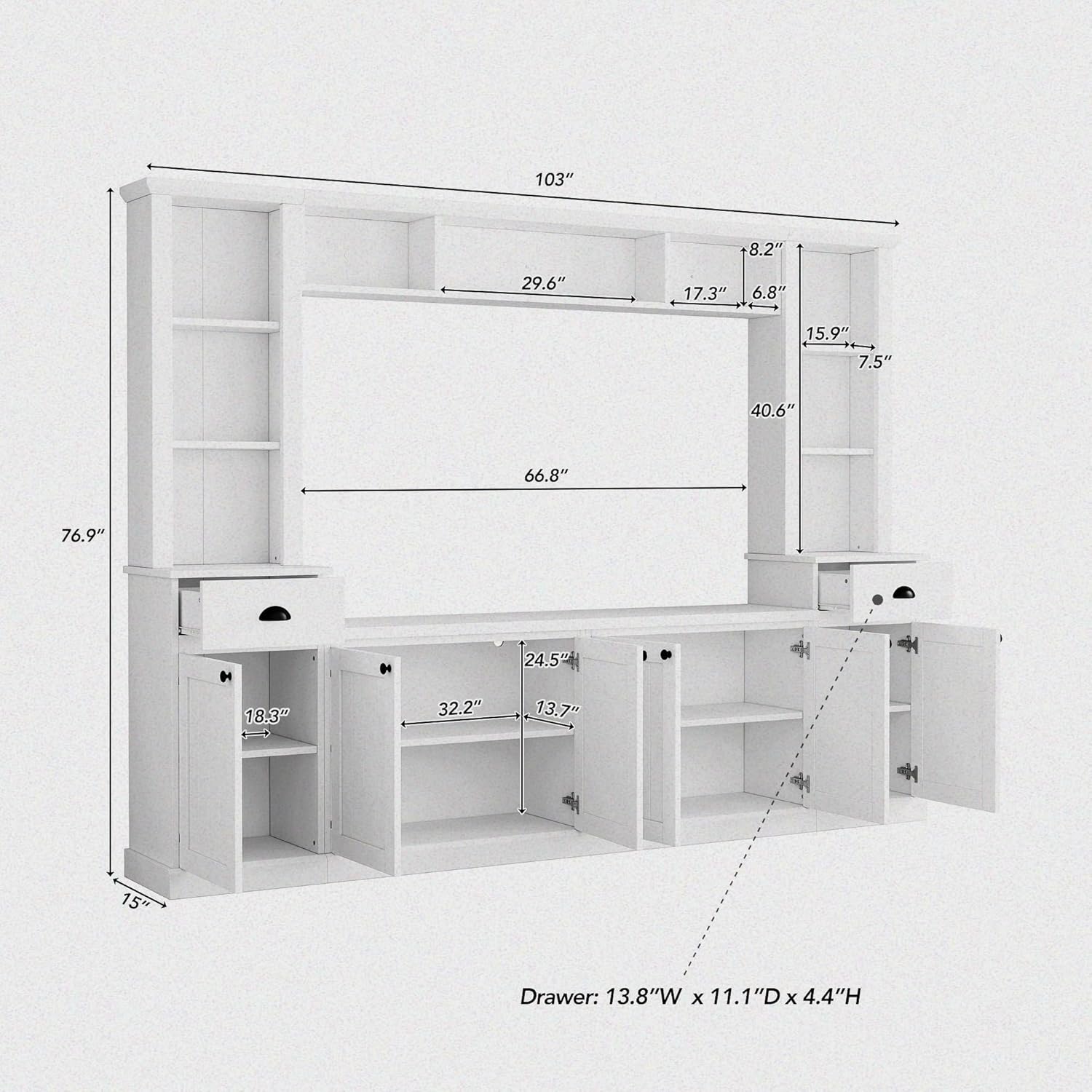 More details Notice Adjustable Placement Height for TV: The top bridge can be locked parallel to both sides of the cabinets, or mounted individually on the wall. Product Type: TV Stand TV Stand Table Top Material: Particle Board TV Stand Table Top Finish Application: Veneer Base Material: Particle Board Base Finish Application: Veneer Weight Capacity Overall: 506LBS / TV Stand Table Top: 88LBS / Drawer: 22LBS Detailed Measurement Overall: 103''W x 15''D x 76.9''H / Drawer: 13.8''W x 11.1''D x 4.4''H Country of Origin: Malaysia Cabinets Included: Yes Number of Cabinets: 4 Drawers Included: Yes Number of Drawers: 2 TV Stand Table Top Thickness: 1.1 inch Level of Assembly: Full Assembly Needed Suggested Number of People for Assembly/Install: 3 Estimated Time to Set Up: 3 h Adult Assembly Required: Yes Additional Tools Required (Not Included): Power Drill Recommended