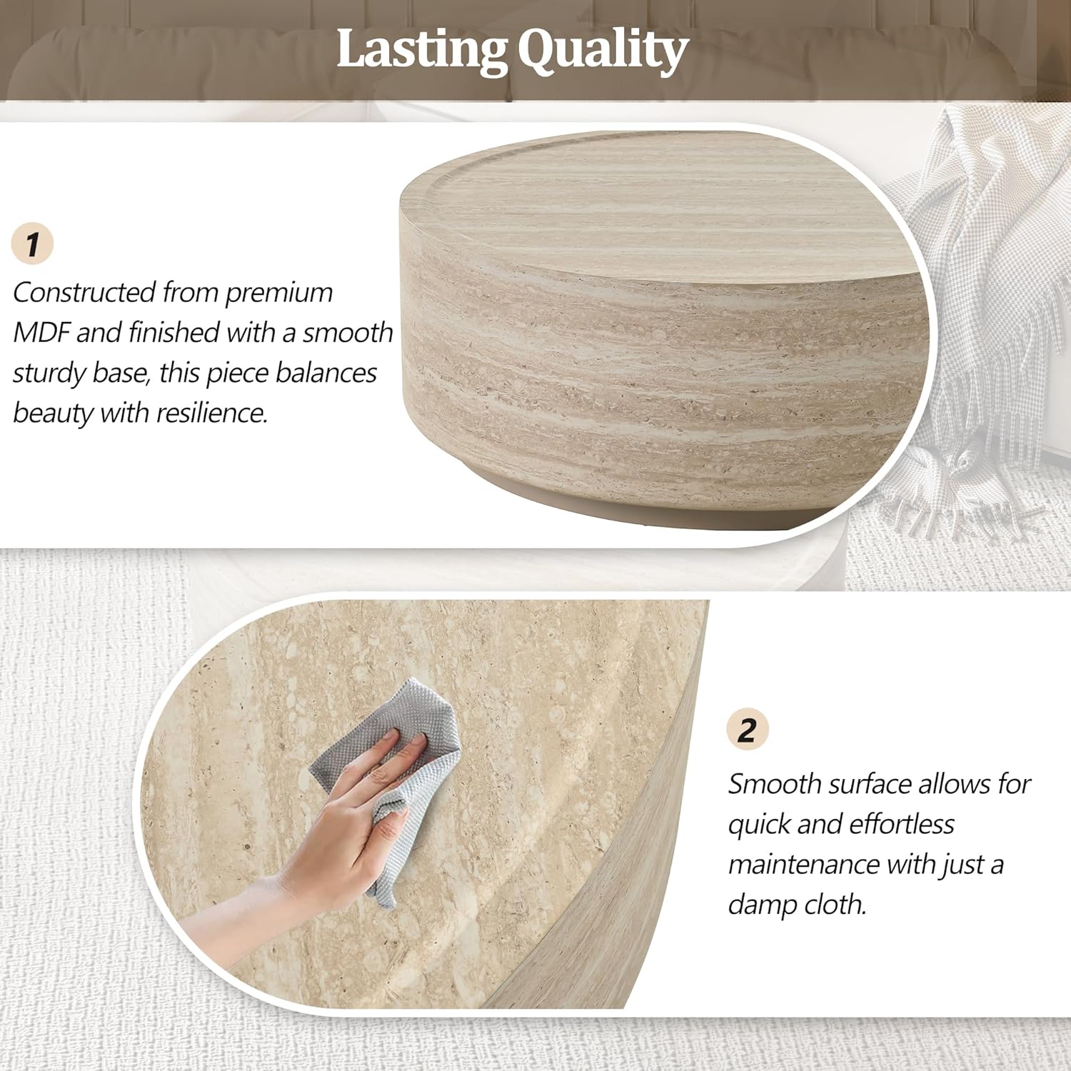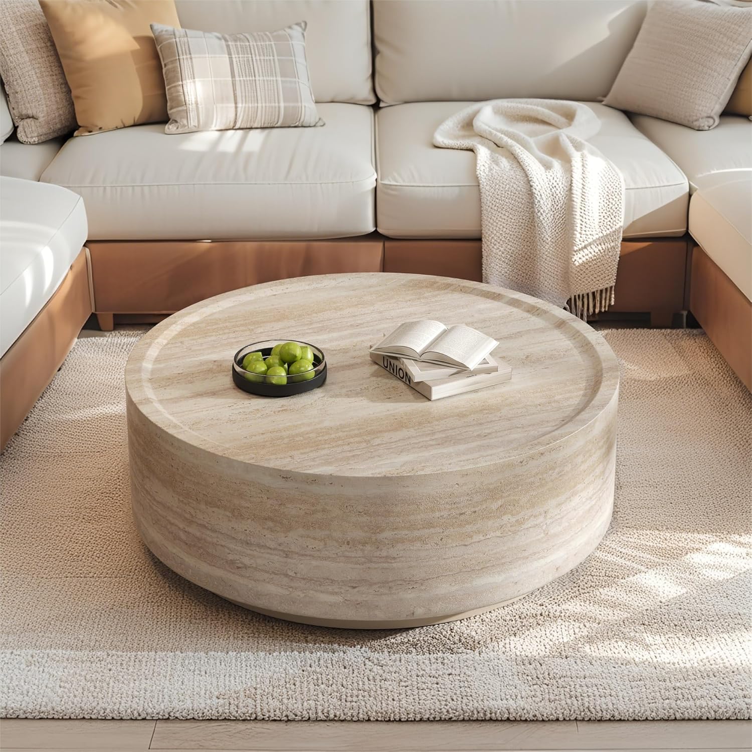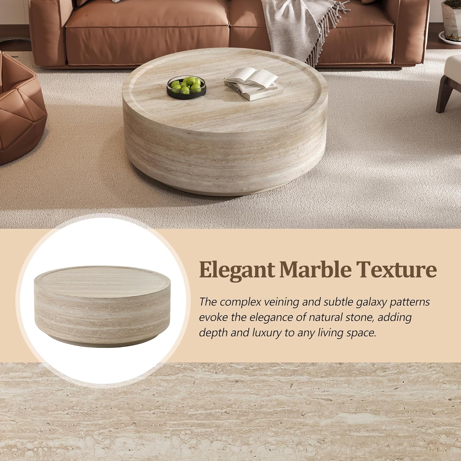 Details: Product Type: Coffee table Top Color: Beige Top Material: MDF Top Finish Application: Veneer Base Color: Beige Base Material: MDF Base Finish Application: Painting Detailed Measurement: 37”W x 37”D x 13.7”H Overall Weight: 36.16 LBS Weight Capacity: 176LBS Country of Origin: China Notice Level of Assembly: No Assembly Required Notice: Board finish materials will vary subtly in color tone, surface texture, and veining. Variations are not considered product defects. (Normal use is not affected.) Notice: Due to the difference between shooting lights and display resolutions, there may be chromatic aberrations between the picture and the real object and the picture on our website is for reference only. Notice: Since the dimensions of our products are manually measured, there may be a little error between the real product and the measurement data. The measurement data is for reference only.