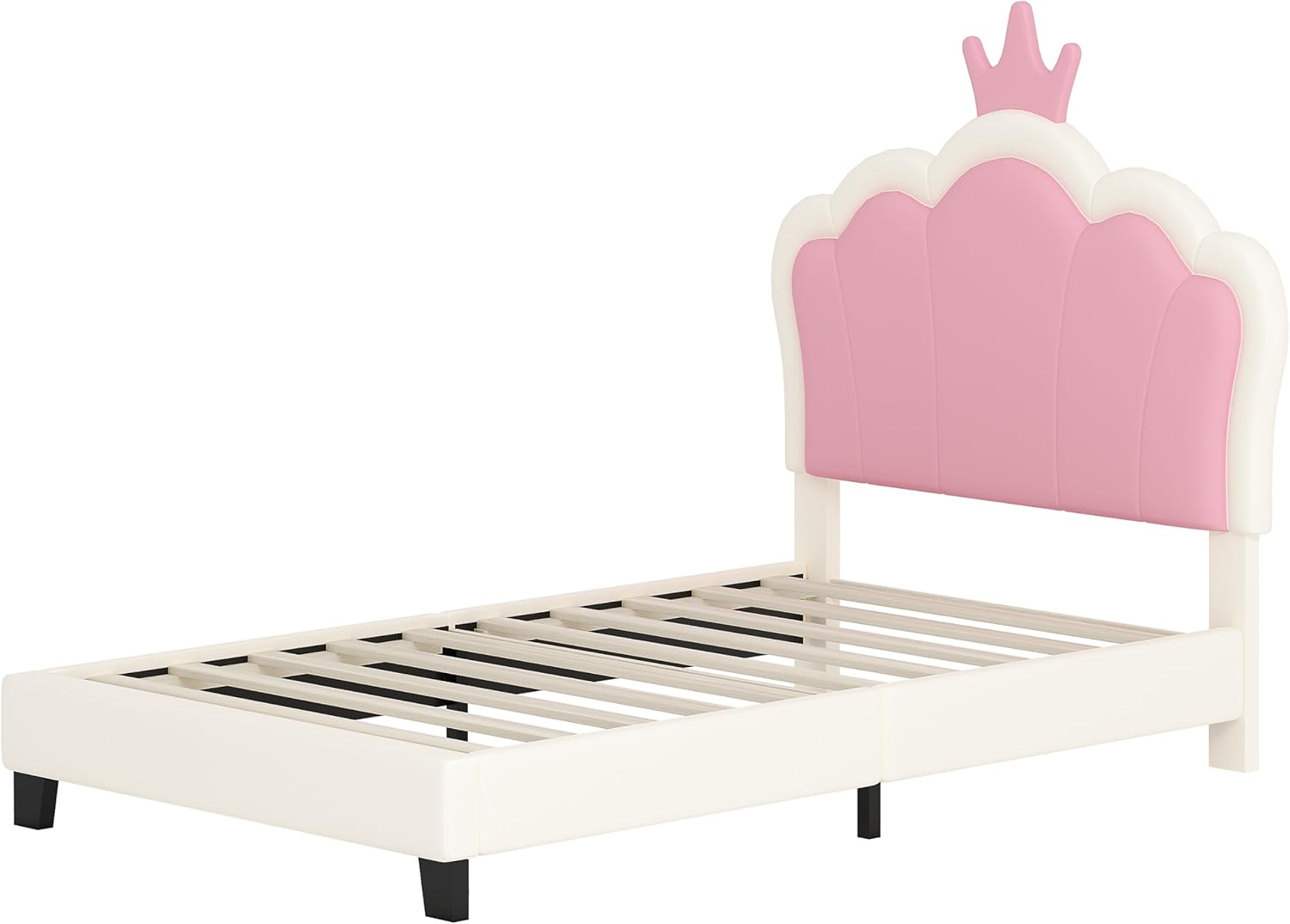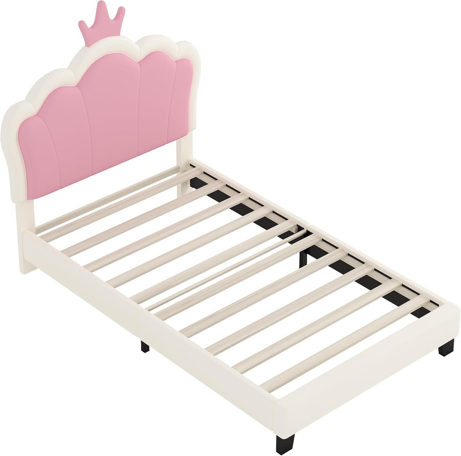 The headboard of this upholstered platform bed is crown shape, the overall shape is full of interest,it is every girl's dream. Featuring strong, solid plywood and supporting slats, this bed is built to last, ensuring it will accompany you for many years. Do not miss the chance take it home today. Details: Product Type: Platform Bed Color: Cream+Pink Material: Plywood+MDF+PU Size: Twin Overall Product Dimension: 80”L x 46.5”W x 44”H Detail Product Dimension: Please refer to the Size image Overall Weight: 55LBS Weight Capacity: 250LBS Number of Slats: 10 Recommended Mattress Thickness: 6-10" Assembly Required: Yes Country of Origin: China Notice: About Color: Real Product's Color may be a little different from the image due to the lighting or monitor's display. About Size: Manual measurement has been used, there may be some reasonable error.