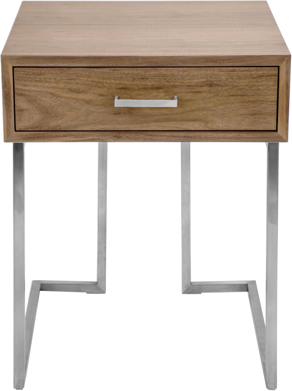 The clean, straight lines of the roman end table make it the optimal piece to slip beside a sofa or next to a bed. The handy drawer hides remote controls, a Journal and pen, or other small necessities. The brushed stainless steel frame adds a note of trendy, industrial design.
