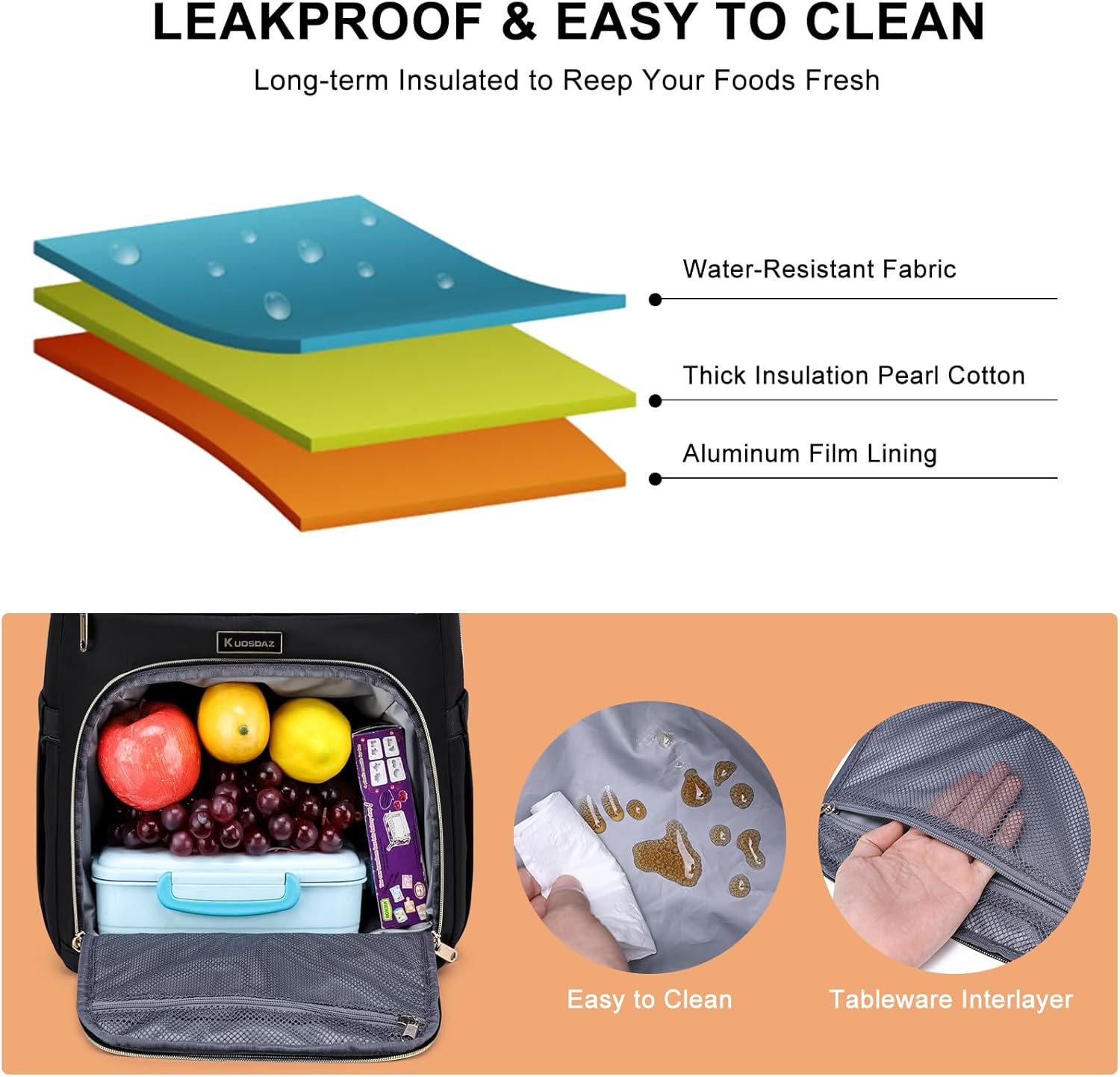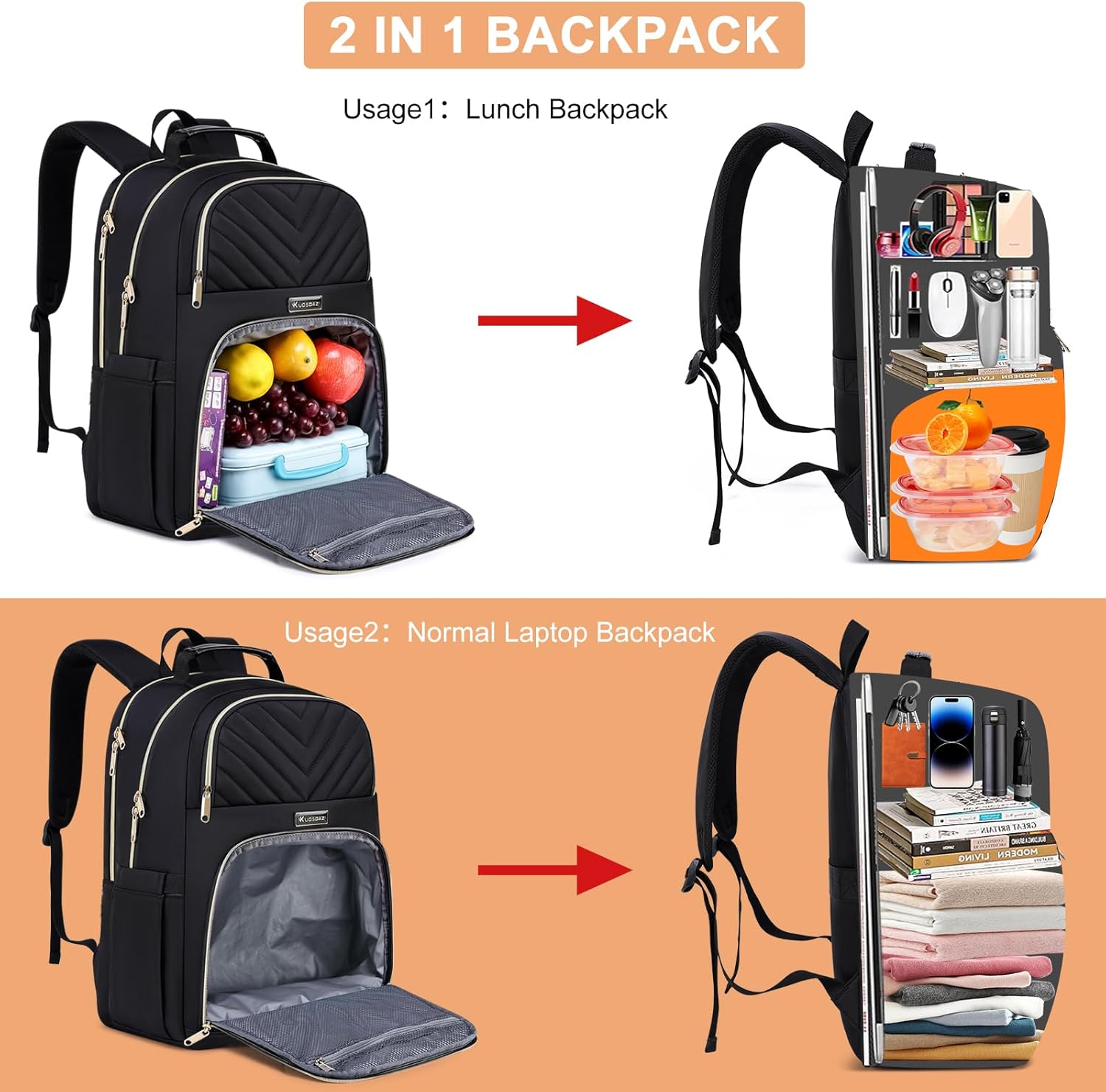 Lunch Backpack for Women Specifications:Dimension: 16.9”H x 12.6”L x 7.5”W.Weight: 1.5 lb.Shoulder Strap Length: Up to 45".Material: Nylon + Metal ZipperLunch backpack for women built from Exquisite gold-plated zippers, long handle, fashion print texture polyester waterproof fabric and gold-plated zipper on the outside,and tear-resistant material on the inside for durability.The insulated cooler compartment is thickened with EPM foam, works together with the water-resistant Aluminum layer to keep the food warm and keep drinks cold about 3-5 hours. Providing comprehensive protection for your lunch and valuable items.This is a stylish lunch daypack, ideal gift for men women