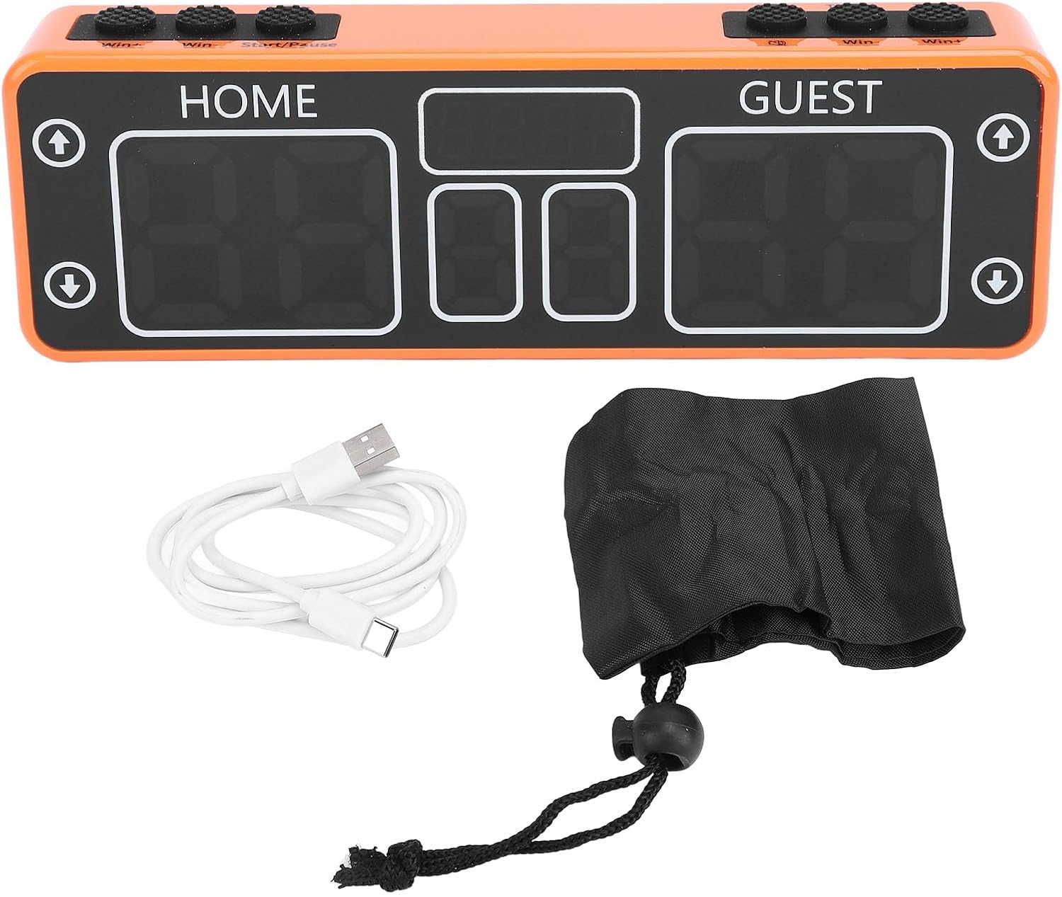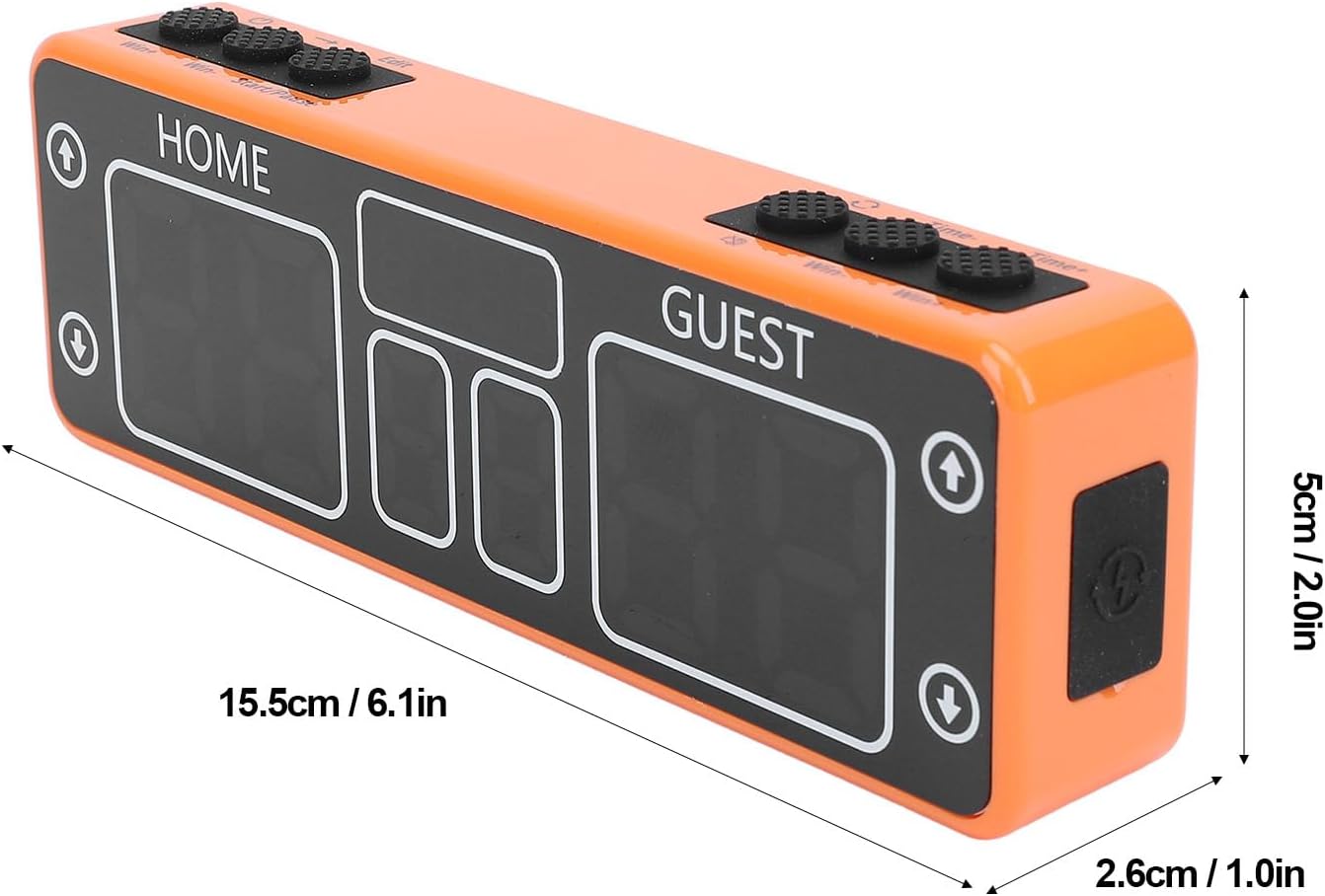Specification: Item Type: Digital Scoreboard Material: ABS, PC, Rubber Weight: Approx. 356.00g / 12.56oz Use: General LED Score Battery: 3.7V 2000mAh Lithium Battery (Built in) Control Method: 6 Buttons, 4 Touch Buttons Power Supply: Current 51mA±19mA Home Score Range: 0-99 Guest Score Range: 0-99 Home Wins: 0-9 Guest Wins: 0-9 Game Time Display: Countdown up to 99:59 Product Size: Approx. 15.5x2.6x5cm / 6.1x1.0x2.0in How to Use: Plug and play. Package List: 1 x Digital Scoreboard 1 x Power Cord 1 x Storage Bag