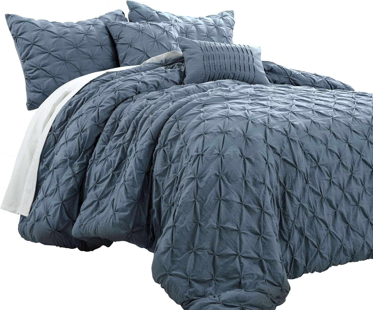 Elevate your bedroom decor with the Lush Decor Ravello Pintuck Comforter Set. This comforter set seamlessly blends with a traditional glam, minimalistic, farmhouse, or transitional style, showcasing luxe pintuck detailing for added texture. The lovely solid color of this bedding set complements a variety of interior designs, while the soft and durable fabric provides comfort and long-lasting quality. Experience the ideal combination of style, comfort, and durability with this cozy bedding set ensuring a peaceful night's sleep. The layers of pintuck detailing give this crinkled microfiber comforter a timeless, textured look. This 5 piece set includes one comforter, two standard pillow shams, and two decorative pillows. This product is STANDARD 100 by OEKO-TEX® certified, which means the fabric, dyes and all components have been tested in an independent laboratory and certified against a list of more than 350 harmful substances. For your convenience, this set is safe to machine wash on the gentle cycle and tumble dry on a low setting. Use a steamer to release wrinkles. Please refer to label for full care instructions.