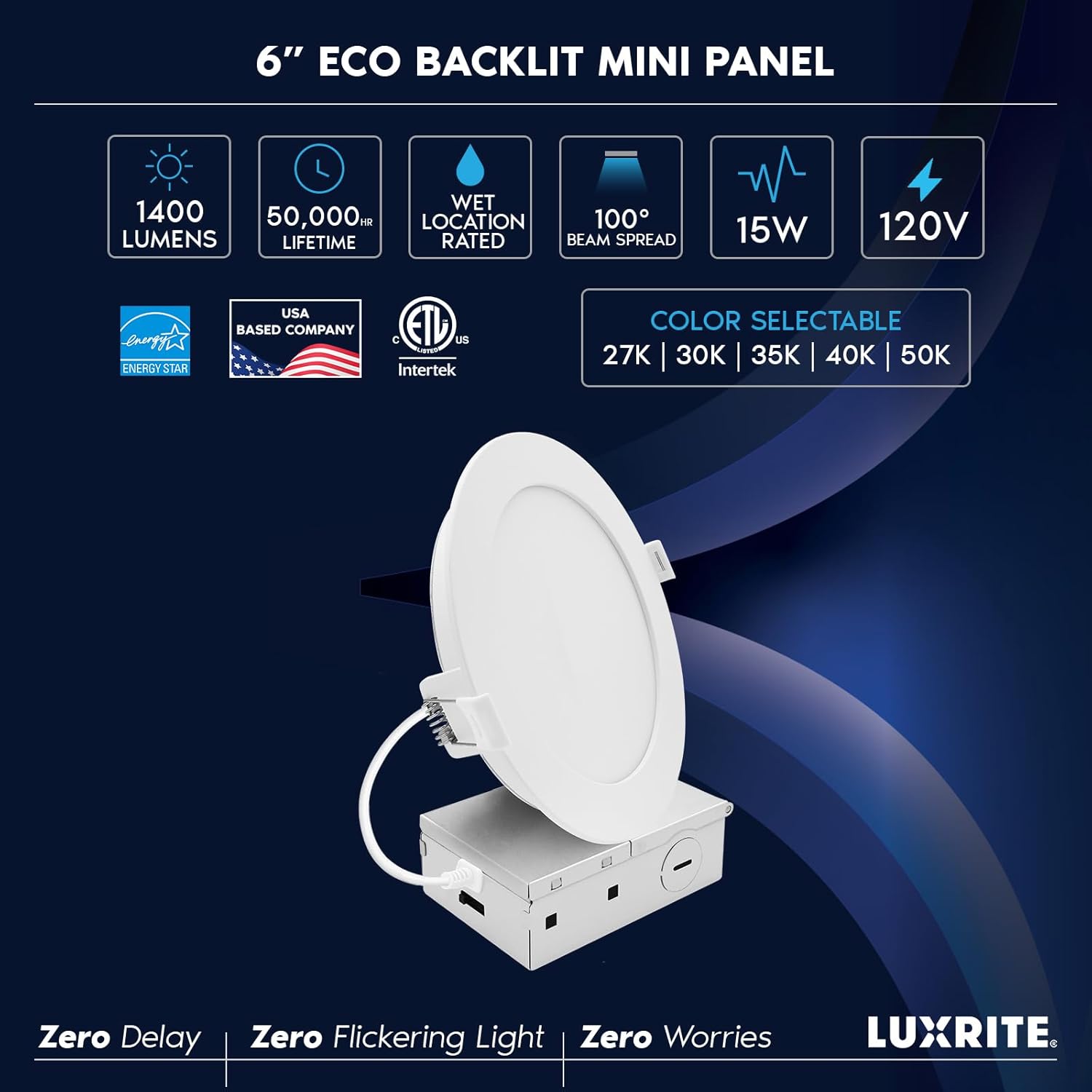 Improve your space with the LUXRITE Recessed Light 6 Inch ECO Backlit High Output Mini Panel Spotlight, designed to deliver efficient, high-quality illumination in a sleek, low-profile form. This LED light panel produces 1400 lumens of bright, even light while consuming only 15 watts, making it an energy-efficient choice for both residential and commercial applications. Featuring 5CCT selectable color temperatures from 2700K to 5000K, you can easily customize the lighting to match your environment, from warm, cozy tones to crisp light. The LED recessed light’s wide 100° beam angle ensures smooth, uniform coverage with minimal shadows, ideal for kitchens, hallways, living rooms, offices, and retail spaces. Built with a clean, round white finish, this recessed panel blends seamlessly into modern ceilings. It is fully dimmable, allowing you to adjust brightness to suit any mood or task when paired with compatible dimmers. With a CRI80, colors appear more natural and true-to-life. Certified Energy Star, this backlit mini panel spotlight is engineered for reliable performance, reduced energy costs, and long-lasting use. Operates on 120V and includes a 5-year warranty.
