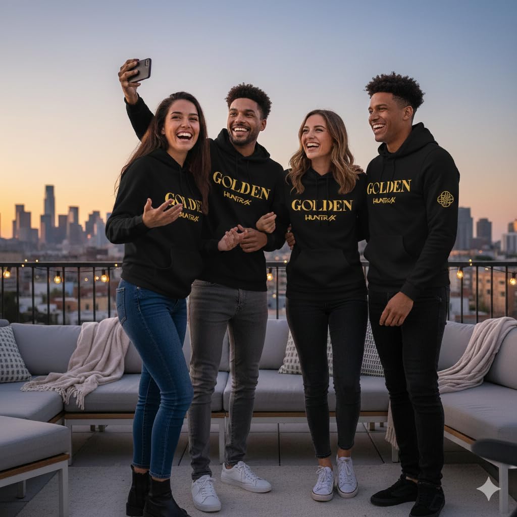 Step into the spotlight with this bold and stylish HUNTRAX "GOLDEN" K-Pop Demon Hunters hoodie — a must-have for any fan of the electrifying HUNTRAX girl group. Featuring striking golden typography across the chest and the sleek HUNTRAX logo beneath, this hoodie captures the glam and power of the all-girl demon-slaying squad like no other. Whether you're channeling your inner Rumi, Mava, or Zoey, this hoodie empowers you to walk with the confidence of a true K-pop warrior. Designed with a soft fleece interior and a sharp, minimalist exterior, this hoodie brings fashion-forward flair to cozy fanwear. The golden emblem on the sleeve ties it all together, nodding to the group’s mythical roots and cutting-edge aesthetic. Whether you're streaming your favorite episodes, repping HUNTRAX at a concert, or just embracing your fandom in everyday life, this pullover hoodie delivers comfort, energy, and unmistakable style.