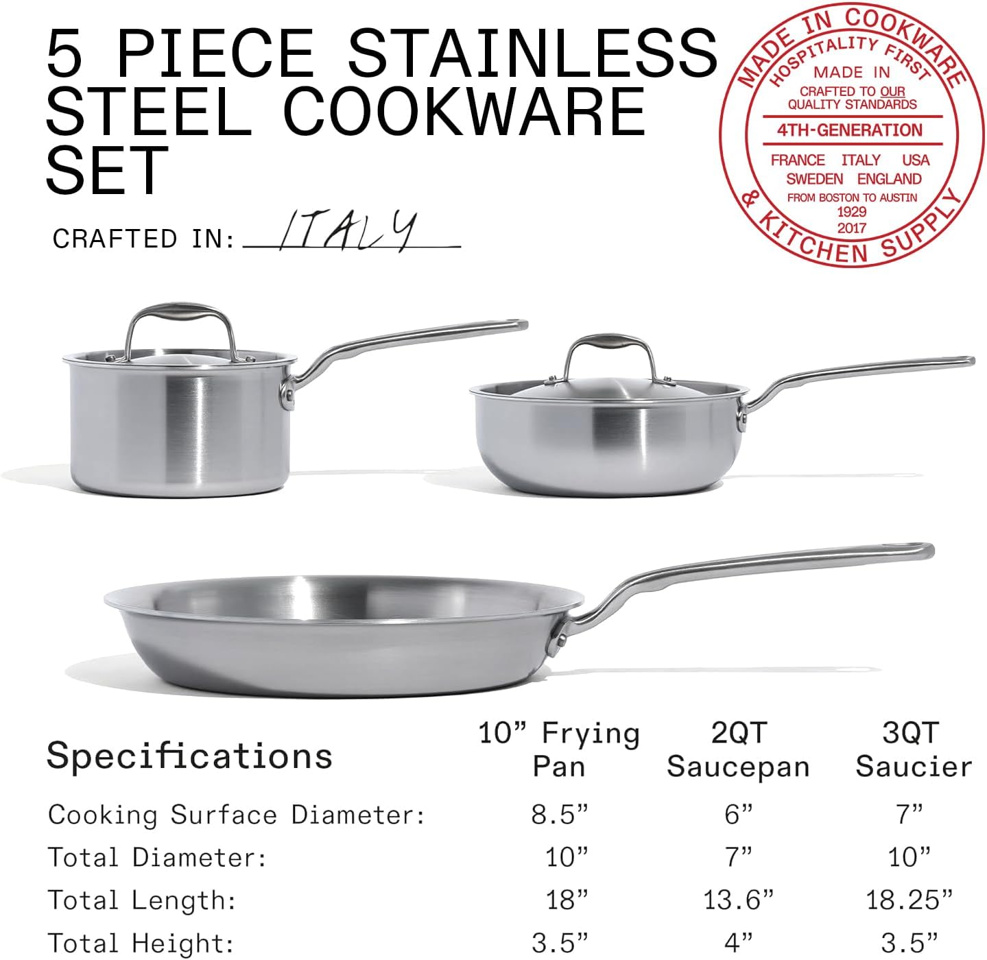 | Included Components | 10" Stainless Clad Frying Pan, 2 QT Stainless Clad Saucepan with Lid, 3 QT Stainless Clad Saucier with Lid |