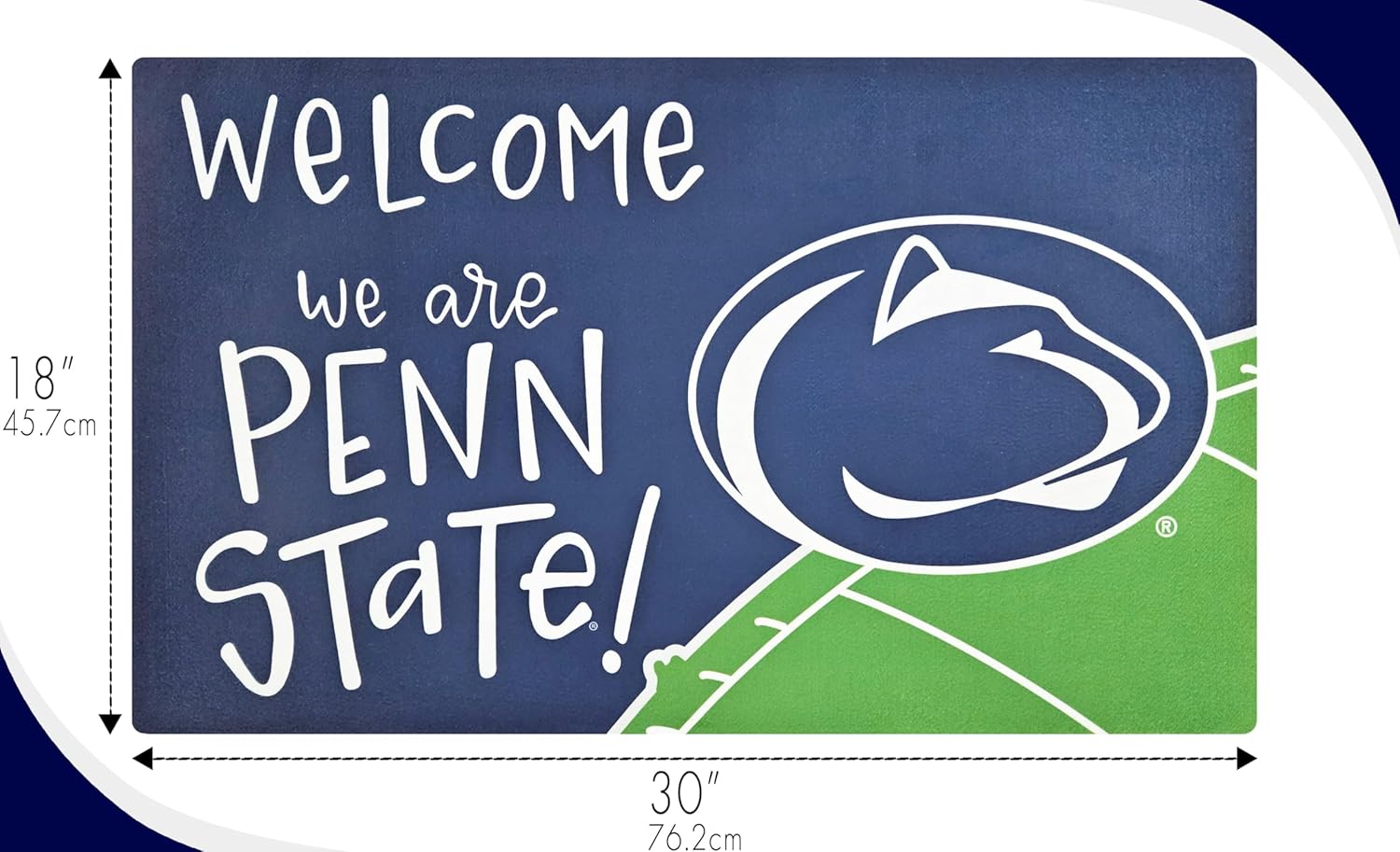 Penn State University Entryway Doormat - Premium 18x30 Inch Welcome Mat by Magnolia Lane - Durable Low Profile Non-Slip Mat - Perfect Home Decor - Gift for Nittany Lions Students, Fans & AlumniThis officially licensed University of Penn State Nittany Lions doormat from Magnolia Lane is a must-have for any true fan. Showcasing a warm "Welcome We Are Penn State!" text greeting against a rich navy background, this mat is perfect for adding a touch of Penn State pride to your home entrance. Made with high-quality materials, this mat is built to last and is perfect for indoor or sheltered outdoor use. It’s a conversation starter and a testament to your dedication to the Nittany Lions.This rug is made with a no-slip rubber backing, and a polyester front to show off the bright artwork colors. Due to the materials used, we recommend this rug be placed at an indoor entry or covered outdoor locations. Extensive exposure to water may cause the color dyes to bleed.Looking for a unique gift that encapsulates the Penn State spirit? This doormat is a thoughtful and functional present for any occasion, welcoming guests into the home of a true Nittany Lions supporter. We Are Penn State!