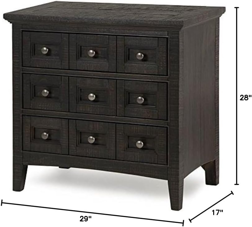 Westley Falls creates the perfect retreat whether lakeside, seaside, in the suburbs or in an industrial city dwelling. The trendy Graphite finish on Pine veneers and solids, accented by aged pewter hardware displays the beaded, framed panel drawers over straight shaker inspired legs handsomely. The rectangular panel bed offers a welcome respite as well a storage rails option while the cases provide additional generous space management.Features:- Materials: Pine Solids, Pine Veneer- Finish: A dry Graphite finish enhances the textured, distressed details and highlights the natural beauty of the wood.- Framed, planked pine wood tops create a high low effect with minor distressing giving unique characteristics to each piece- Three drawers including a felt lined top drawer, feature beaded framed panel drawer fronts- Drawers constructed with dovetail joinery and a side mounted metal ball bearing guide system for strength and durability- Sealed for dustproofing to ensure the contents of your drawers remain clean, while adding structural integrity- Accented by Aged Bronze hardware- 28 inches high x 29 inches wide x 17 inches deep- No Assembly Required