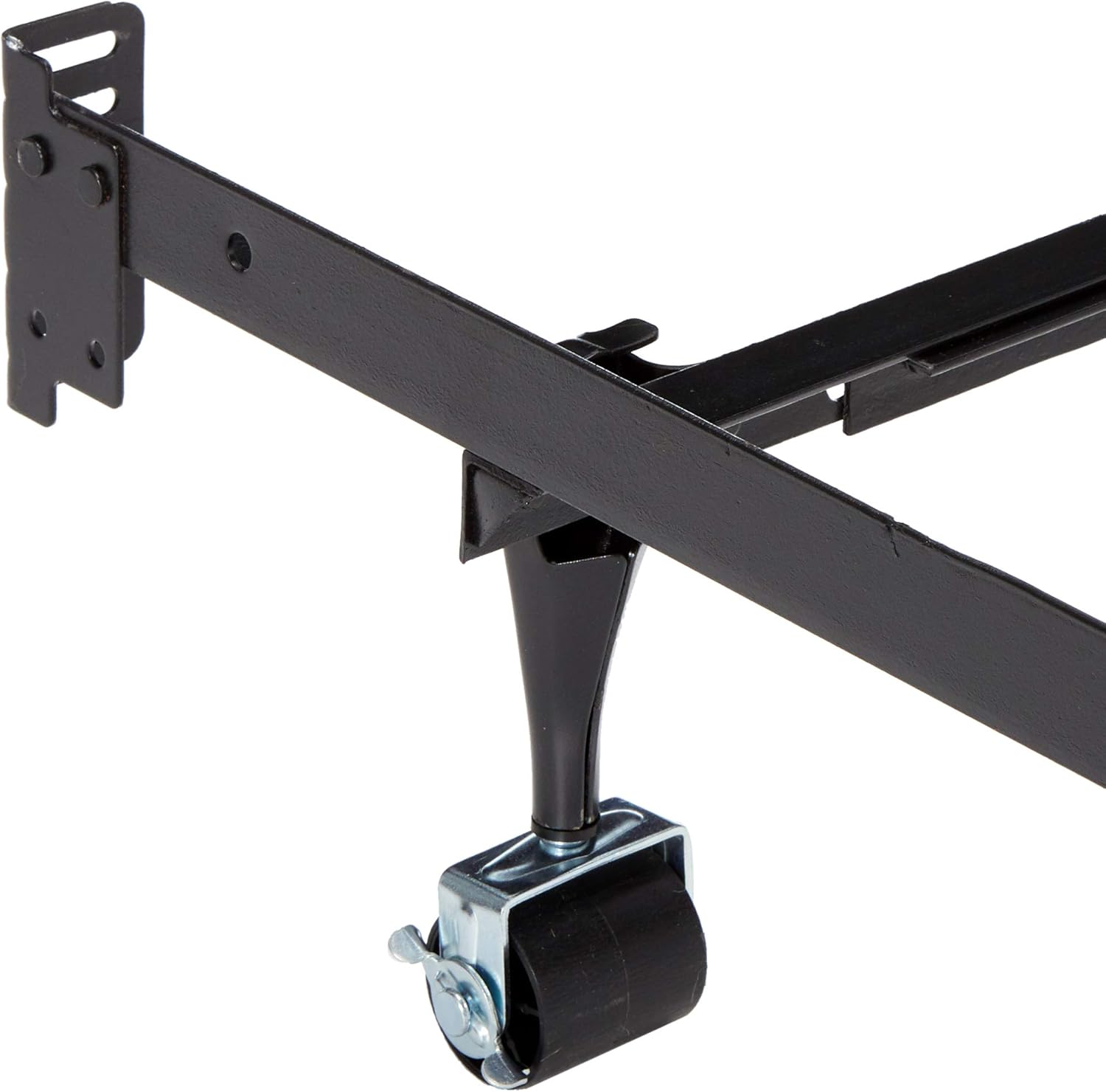 Heavy Duty SupportSupport your mattress and box springs with a heavy duty steel bed frame engineered to support the thicker, heavier mattresses of today. A 2.5-inch center support bar offers extra support through the middle of the bed and fulfills mattress manufacturers' support warranty requirements. Side rail angle iron steel is 1.5 inch by 1.5 inch and cross arm angle iron steel measures 1.25 inch by 1.25 inch. Mobility and SafetyFrame features four 2.5-inch, extra-wide rug rollers. Two of the rollers lock for safety and stability. Two center support glides allow mobility when desired. Easy SetupFrame is easy to assemble in under ten minutes and no additional tools are required. Universal headboard brackets accommodate virtually any headboard configuration. Finished with a durable and stylish gunmetal black matte powder coating. Manufacturer WarrantyFeatures a 5-year warranty that guards against manufacturer defects and workmanship. Adjustable Bed FrameFrame adjusts easily to fit the following bed sizes: California KingKingQueenFull XLFullTwin XLTwinStyle:Industrial,Mid-Century Modern,ModernRollers Dimension:70 x 38-76 in Height:7.5-8 in.Glides Dimensions:70 x 38-76 in, Height:7.5-8 in