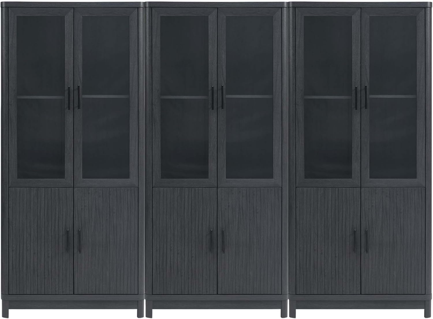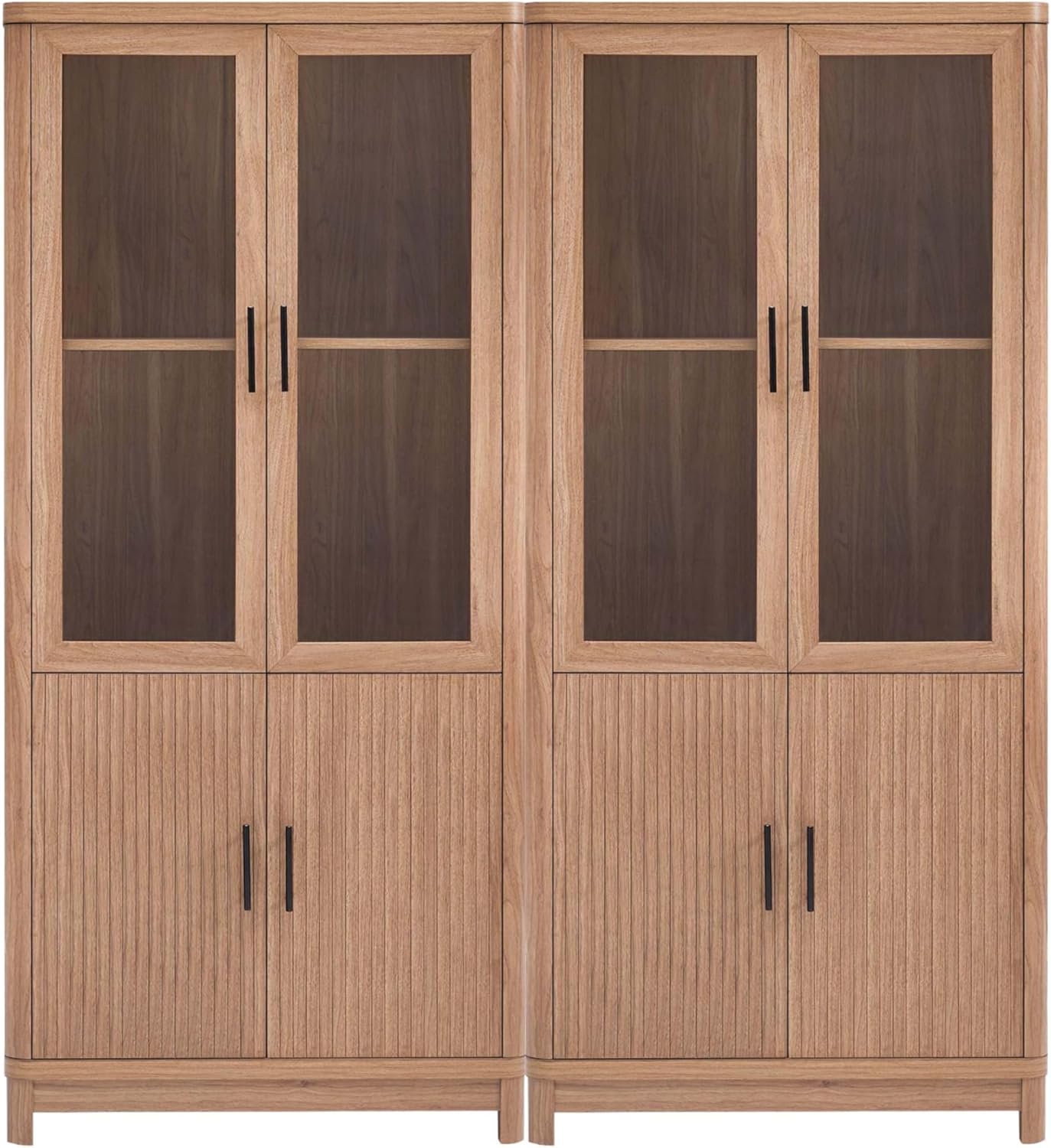 Elevate your home decor with the timeless elegance and functionality of the Jodie Mid-Century Modern Bookcase set. Crafted from premium manufactured wood and finished in a beautiful tone, each bookcase in this collection is designed to bring a sophisticated touch to any space, whether it's your living room, home office, or library. The combination of ribbed wood accents on the lower cabinet doors and sleek black metal handles creates a striking contrast, while the splayed metal legs offer stability with a modern edge.Each Jodie bookcase features two soft-close tempered glass doors on top, perfect for displaying your favorite decor, books, or collectibles while keeping them protected from dust. The six adjustable shelves inside offer a customizable storage solution, allowing you to tailor the space to fit your needs, from large items to smaller trinkets. Below, two ribbed wood soft-close doors open to reveal additional concealed storage, ensuring a clutter-free and organized environment.Designed to not only provide practical storage but also to serve as a centerpiece in your home, each bookcase boasts a refined wood grain finish, adding warmth and texture to any room. The durable manufactured wood construction ensures that each piece is built to last, while the black metal handles and legs enhance the overall aesthetic with a touch of modern industrial charm.Whether you're using these bookcases to organize your home office, showcase prized possessions, or simply enhance the overall decor of your living space, the Jodie Mid-Century Modern Bookcase set seamlessly combines form and function. Assembly is straightforward with all hardware included, allowing you to enjoy your new stylish storage solution in no time.