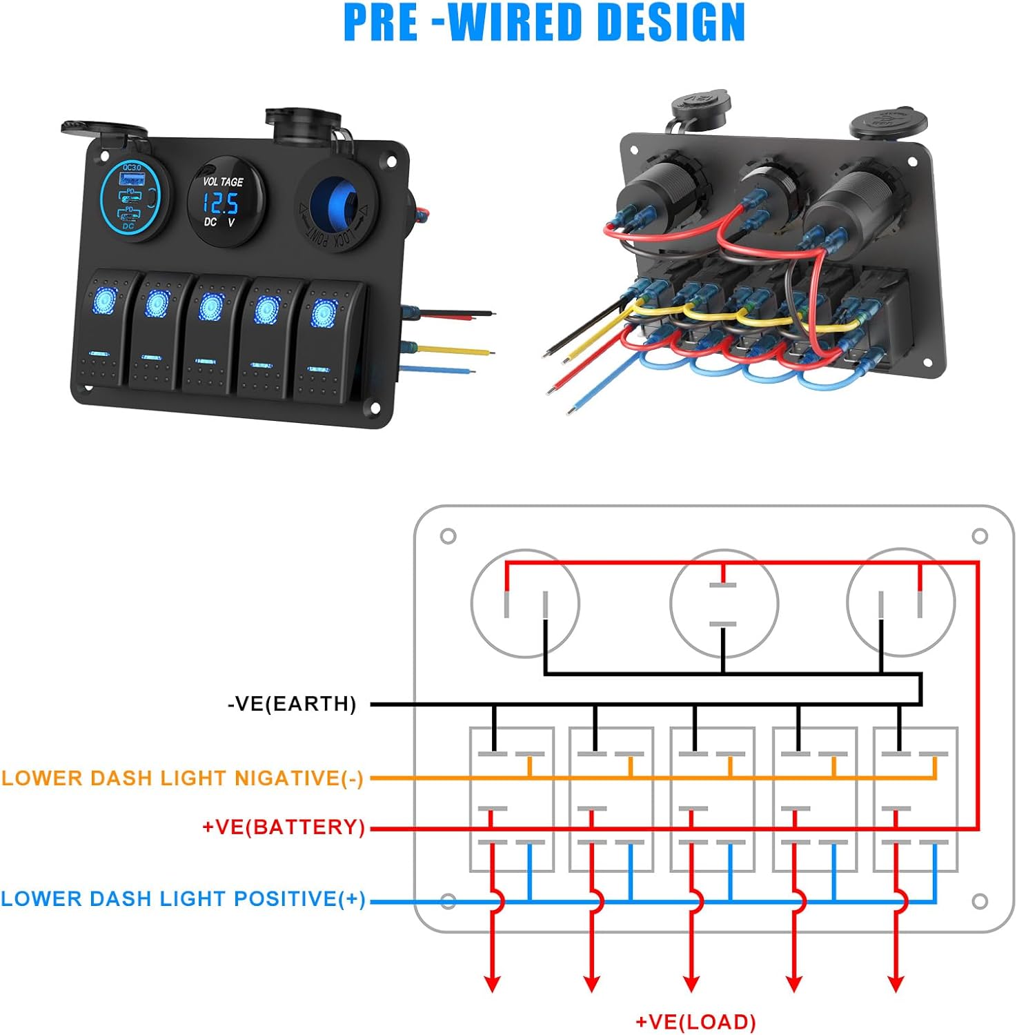 Marine Boat Switch Panel Waterproof, 5 Gang Marine Rocker Switch Aluminum Panel, 12V USB Outlet Marine Switch Panel Plug