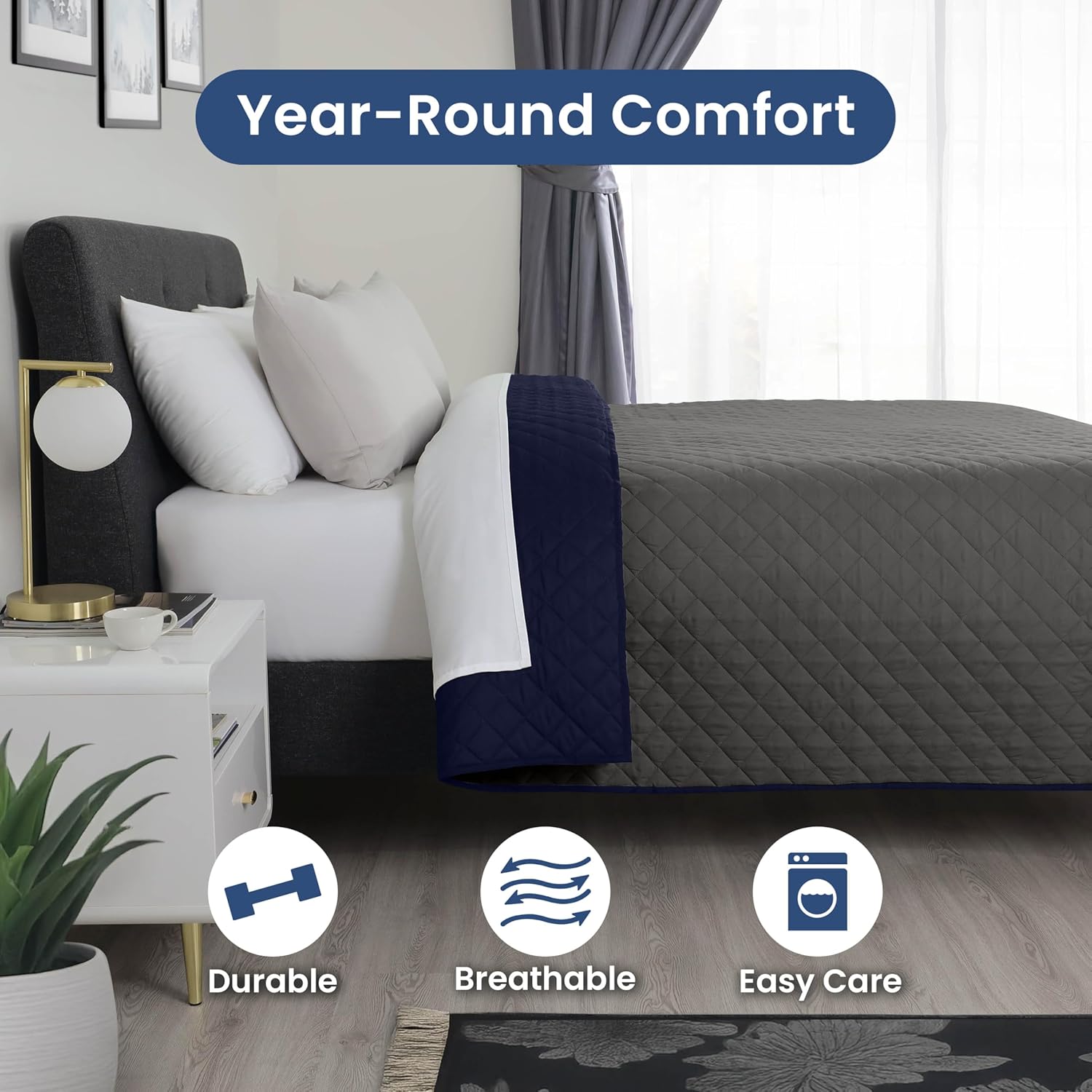 Looking to change things up switching your bedding is a cinch with this reversible coverlet. Crafted of polyester with polyester fill, this coverlet features an intricate woven quilt stitch detailing, square corner trim, and a reverse color binding. Boasting choices of khaki/red, ceil blue/khaki, or Graphite/Navy, it's the perfect addition to your bedroom scene. Available in twin, full/queen, and King sizes.