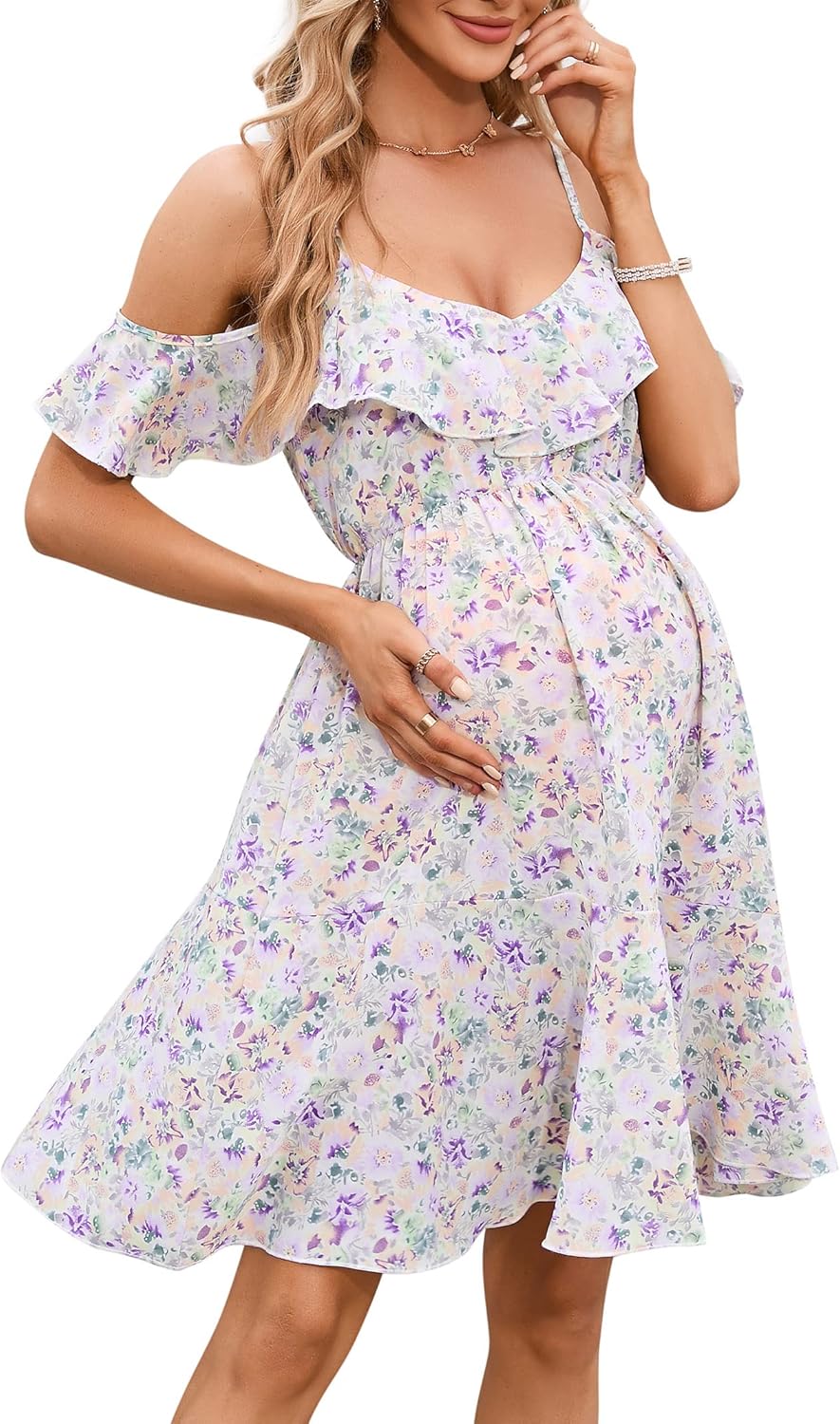Maternity Nursing Dress Womens V-Neck Spaghetti Strap Ruffle Sleeve Daisy Printed A-Line Tiered Flowy Swing Dress