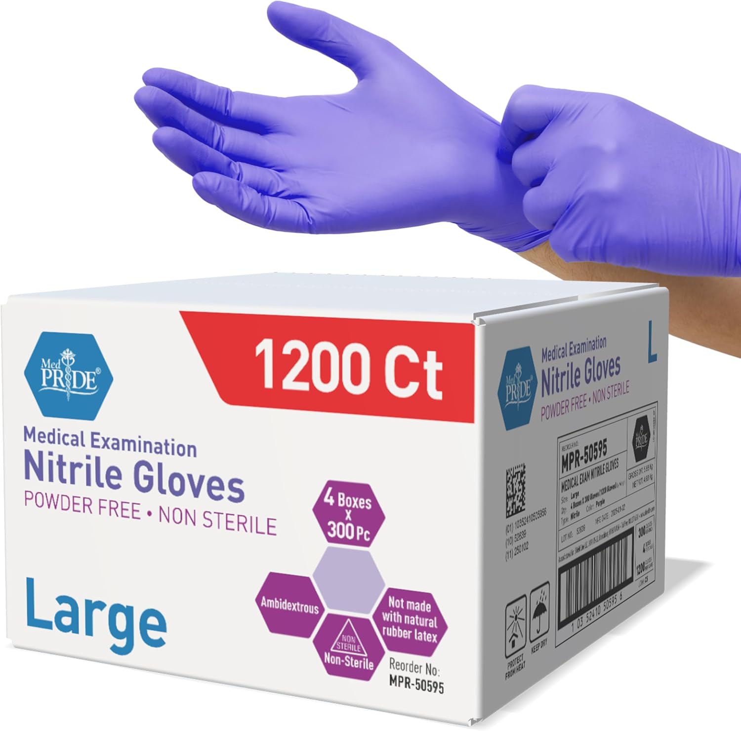 MEDPRIDE nitrile exam gloves in a bulk case format are designed for professionals who require consistent, high-volume glove usage with dependable performance. Each case contains 1,200 disposable gloves, packed as four boxes of 300, making it ideal for clinics, hospitals, dental offices, laboratories, food service operations, and commercial facilities. Made from durable nitrile material, these gloves provide strong puncture resistance while maintaining flexibility and comfort. The powder-free and latex-free formulation helps minimize skin irritation and is suitable for users with latex sensitivities. Textured fingertips enhance grip and precision for medical exams, procedures, cleaning tasks, food handling, and general professional use. This bulk case format supports efficient inventory management while ensuring gloves remain clean, accessible, and ready for use in fast-paced environments.