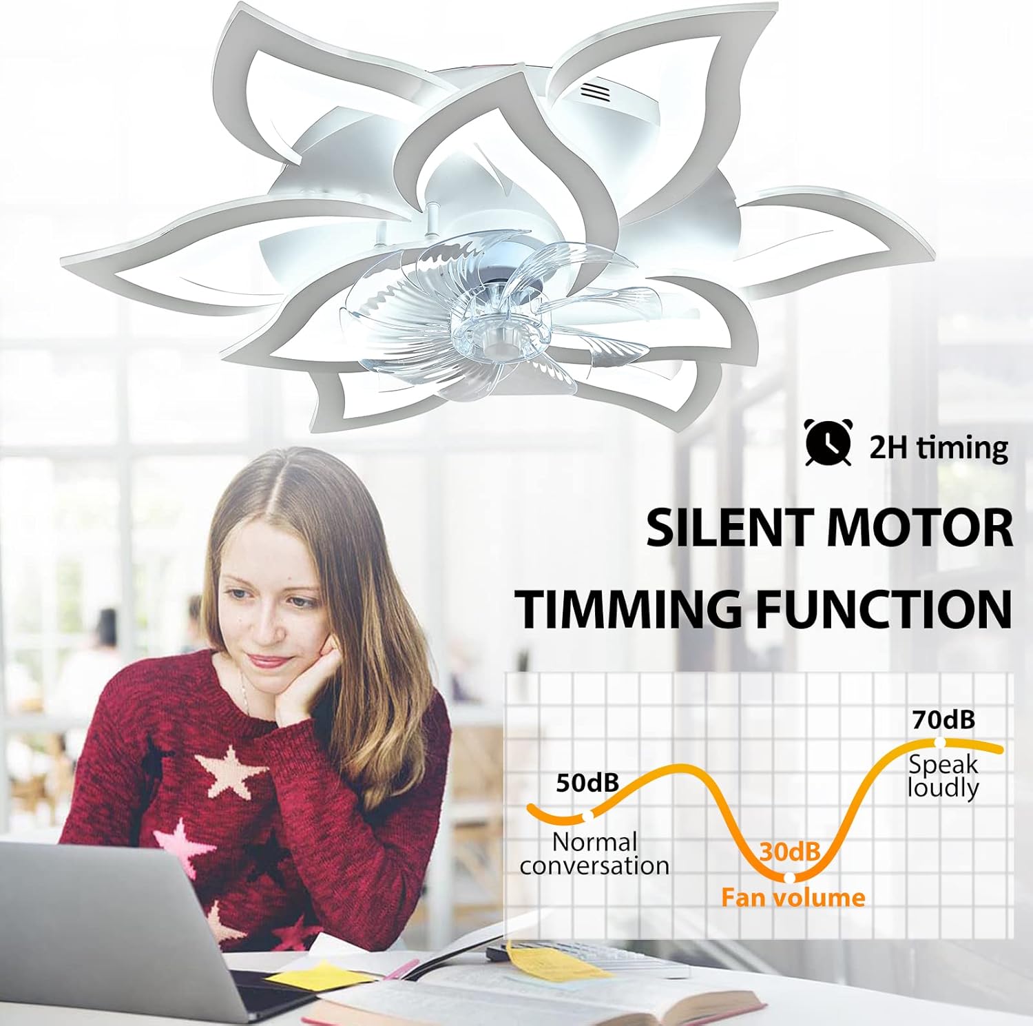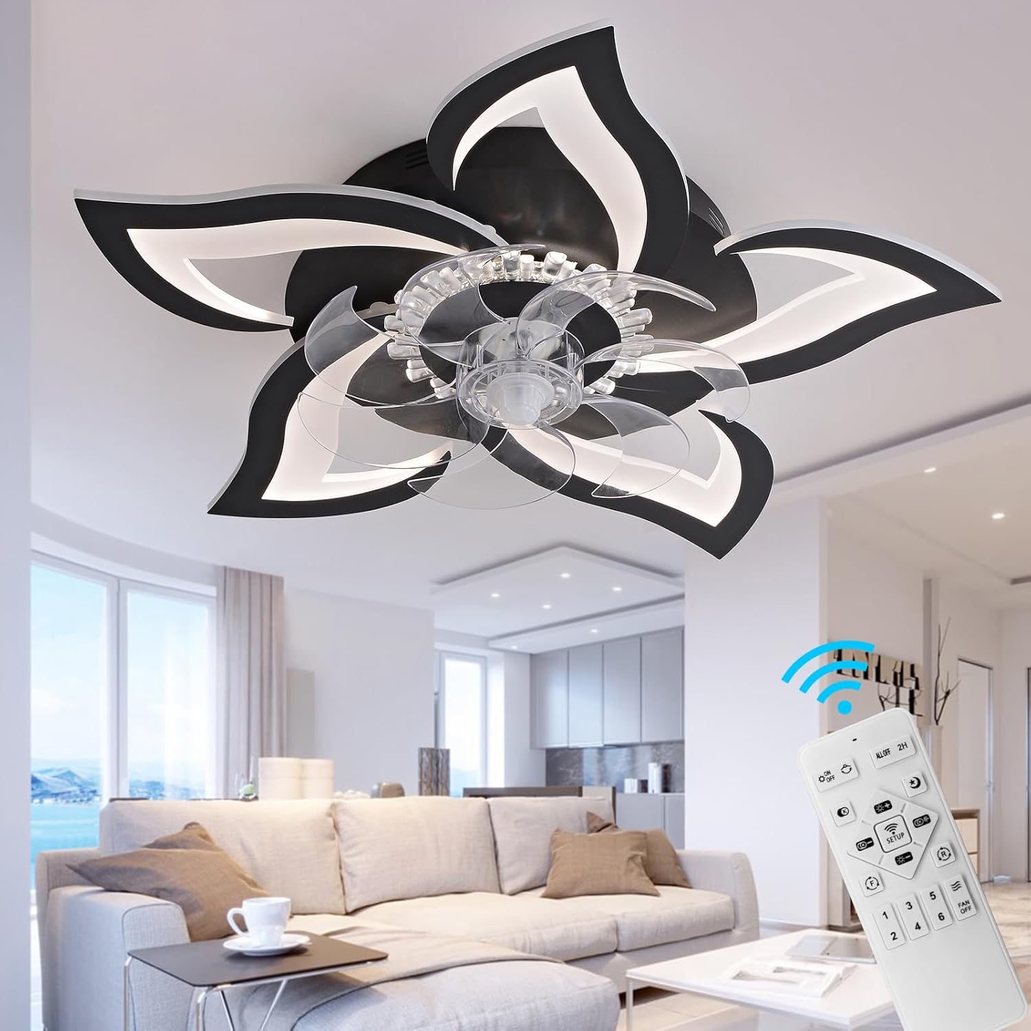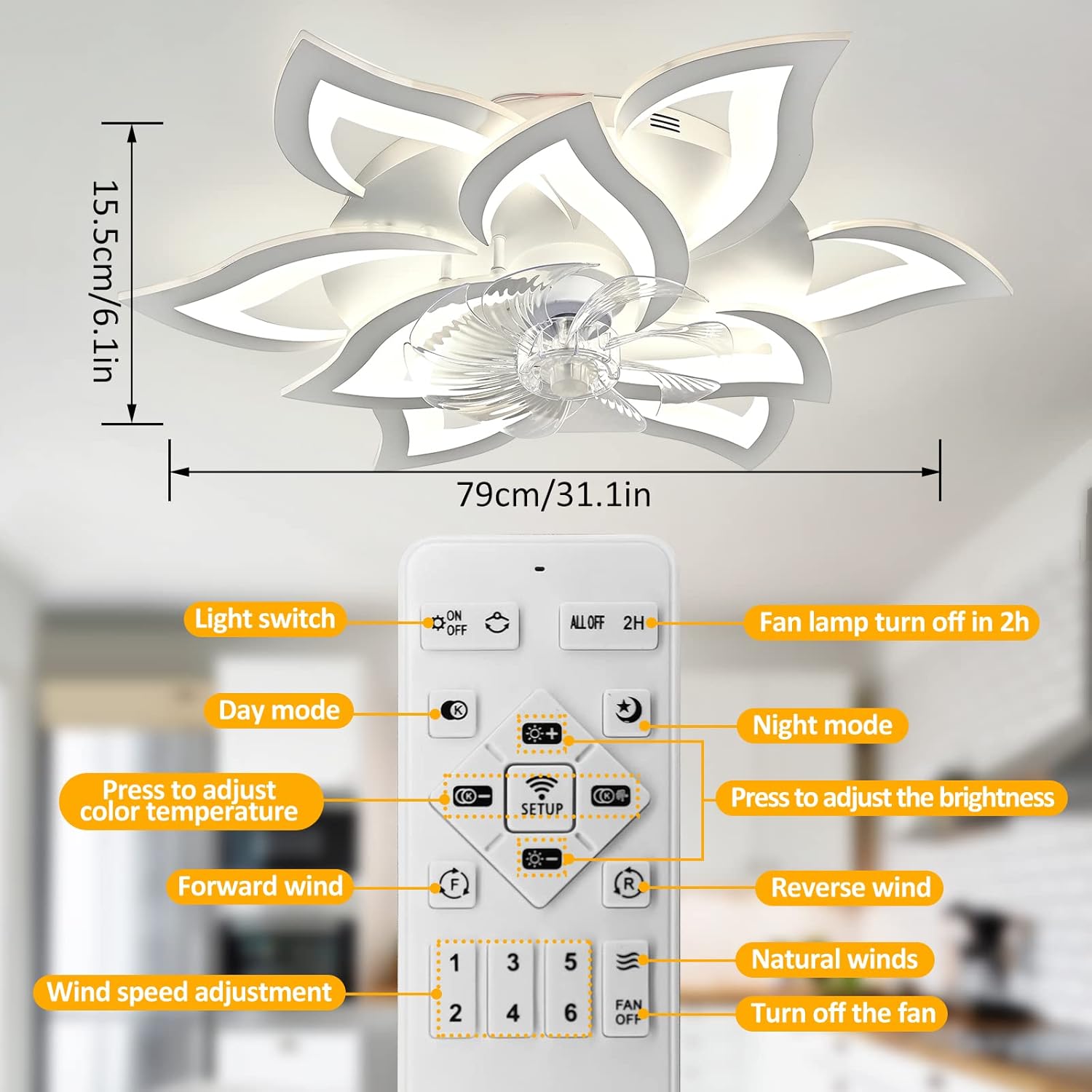 MeiMeiDa Smart Ceiling Fan with Lights Remote Control, Modern Flush Mount Bladeless Ceiling Fan, Low Profile Ceiling Fan with Light for Bedroom Living Room Kitchen, Flower Shape, WhiteSpecifications:White ceiling fan with 5-head diameter: 27"", white ceiling fan with 9-head diameter: 32""Fan blade size: 13.4"" (diameter) * 5.12""(length) * 2.36""(width) Moungting base: approx 17.72"" in outer diameter Material: ABS fan body + 6 clear ABS fan blades + plastic mounting baseController Type: remote control Mounting Type: flush mountDC Motor, motor wattage 35WVoltage: 110VLED Light Wattage: 36WAssemble RequiredFeatures:Stepless Dimming and 3-Color Temperature - the smart ceiling fan light use remote control to adjust the color temperature and brightness. You can adjust your color temperature between warm light 3000K and cool white 6000K and adjust the brightness from 0 to 100%Reversible Blades - our flush mount ceiling fan with light includes counter-clockwise and clockwise feature to control the wind directions and air movements and allow you to keep your room cool in the summer or re-circulate warm air from the ceiling in the winterMemory Function - when using the remote control to turn on/off this low profile ceiling fan light,which will automatically restore the light color you previously set (SWITCH CONTROL NOT SUPPORT LIGHT MEMORY)Night Light Mode - thoughtful night light mode helps to create better sleeping environment for your familyTiming - 2-hour timing setting on the remote for easy controllability of this fan's woking hours6- Speed Wind - this flush mount ceiling fan with lights remote control designed with 6 wind speed option, just press the number 1-6 button(low, medium, high wind speeds) to adjust as your needsSilent Motor & Energy efficient Led Strip - Quiet motor morden ceiling fan generator whisper noise to improve quality of sleep; long-life span integrated dimmable LED light strips, no need to change a bulb,offering a more cost-efficient, greener and safer way to light your homeEasy to use - the ceiling fan and the light can be separately turned on or turned off using the remote controlSuitable for a room of 160-320ft, great ceiling fan light for bedroom,living room,hallway,over kitchen sink etc. NOT RECOMMENDED FOR USING IN BATHROOM1-YEAR Worry-Free Warranty AND FREE REPLACEMENT PARTSPackage Content:Fan body5/9 flower headsHardwares and ScrewsRemote ControlManual
