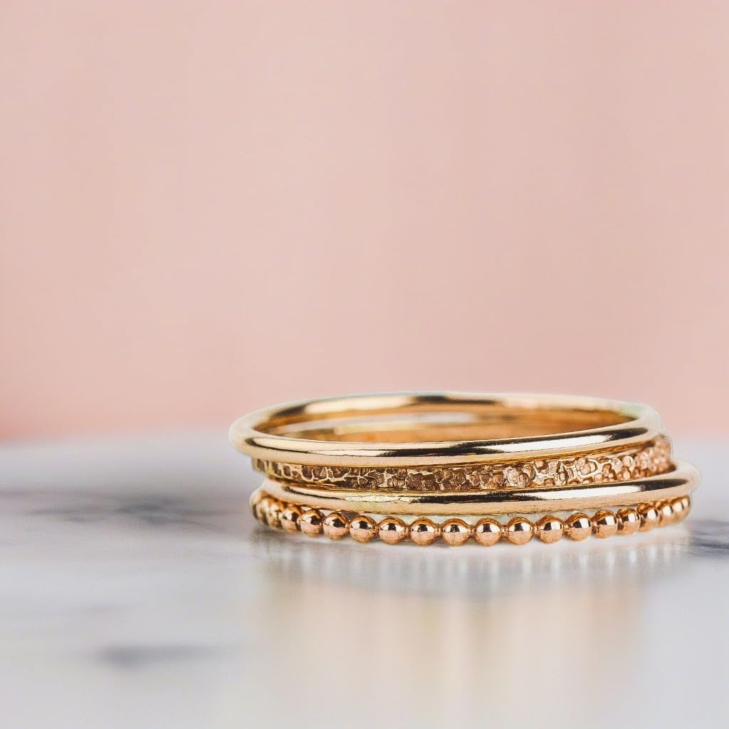 Add a touch of elegance to your jewelry collection with The Claire Stack - a set of 4 stacking rings. These stackable ring bands come in gold, rose, or silver mixed hammered finishes that are perfect for any occasion. Crafted with high-quality materials, The Claire Stack rings are designed to last. Their durable construction makes them ideal for everyday wear while their timeless design ensures they will never go out of style. Mix and match the different finishes to create your own unique look or wear all three together for a bold statement. Whether you're dressing up or keeping it casual, The Claire Stack is the perfect accessory to complete any outfit. PRODUCT DETAILS & MEASUREMENTS - Handmade in Texas by Melanie Golden Artisan Jewelry. - Material: 14K Gold Fill, 14K Rose Gold Fill, or 925 Sterling Silver - Size: Made-to-order in your size - Band Width: About 1.5mm - Sold Per: Set of 4 rings PACKAGING Your jewelry will arrive packaged in a jewelry box to ensure protection during shipping and ease of gifting with a black tarnish strip to protect the jewelry from the elements. Jewelry care information is also included.