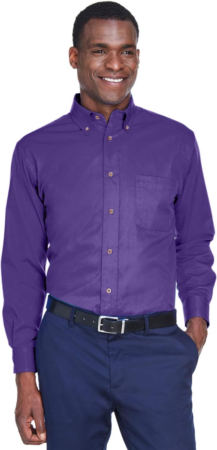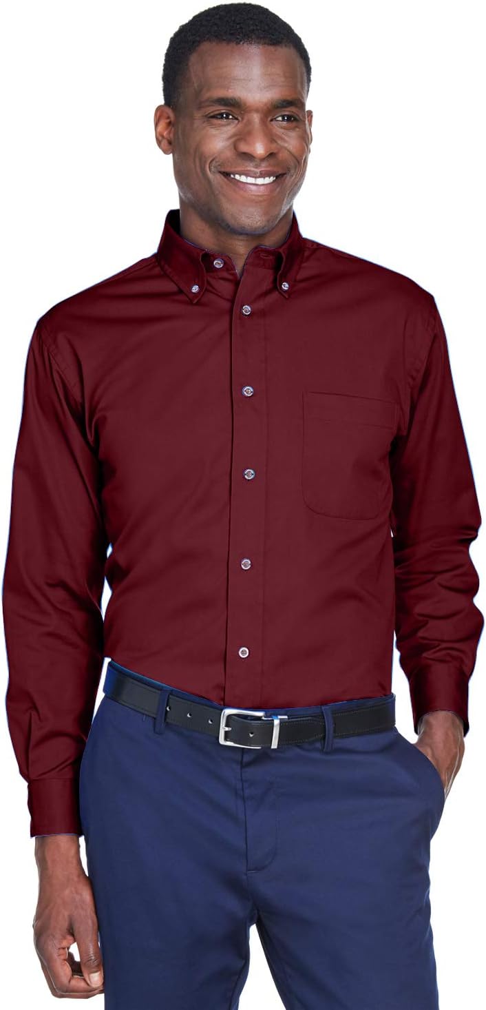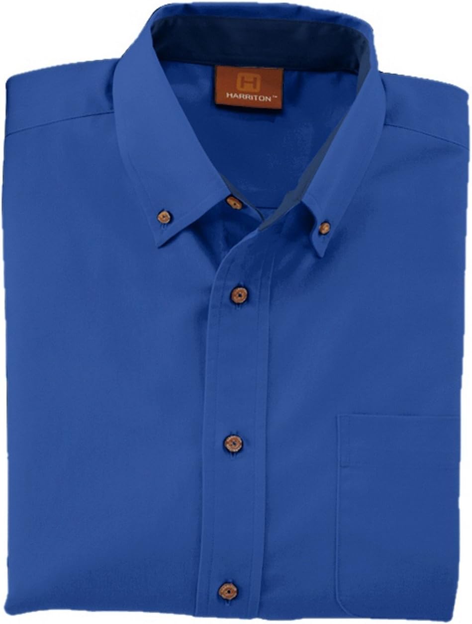 4.6oz/yd² / 155 gsm, 55% cotton, 45% polyester twill Stain-release Wrinkle-resistant performance Extra stitching at seams and buttons Flat-felled seam finishing Signature horn-style buttons with Harriton logo Full back yoke and back pleat Two-button adjustable cuffs Button-down collar Left-chest pocket