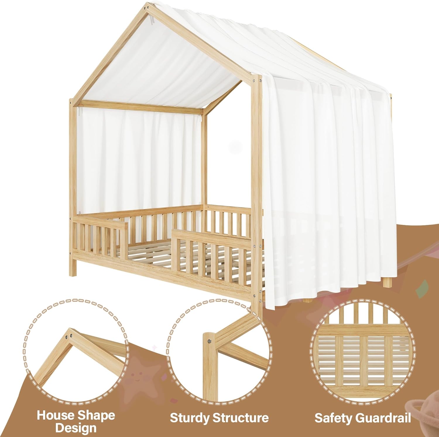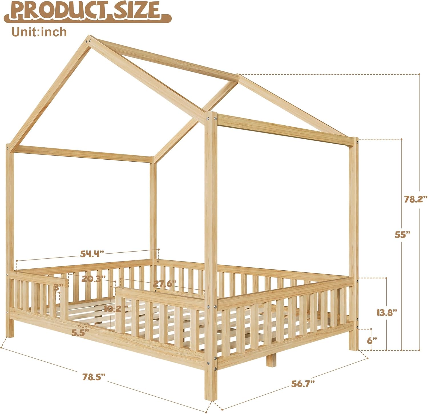 | Item Type Name | Montessori Floor House Bed with Canopy, House Shape Toddler Bed Frame with High Railings, Wood Kids Bed with Roof |