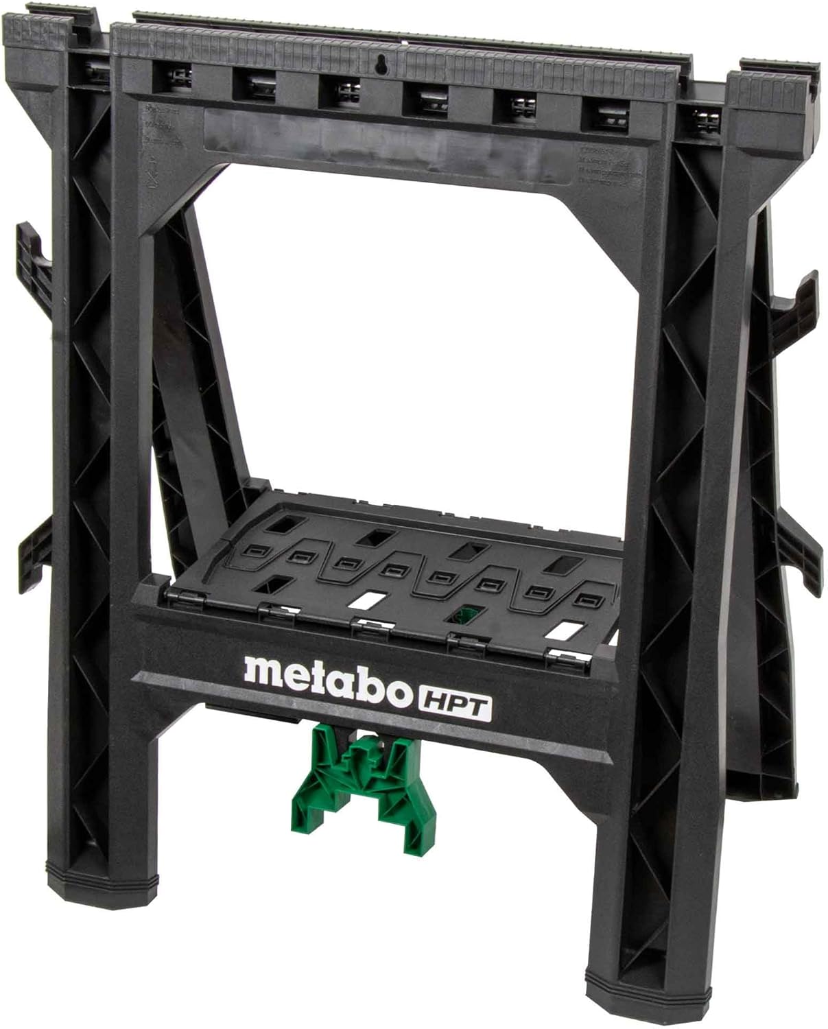 Lightweight, durable, and built for versatility, the Metabo HPT Heavy-Duty Sawhorse 2-Pack is the ideal solution for job sites, workshops, or DIY projects. Each saw horse supports up to 1,200 lbs, engineered for strength, yet weighs only 11.8 lbs (per pair) for effortless portability. The fold-flat design allows for quick setup and compact, space-saving storage. For added convenience, each unit features a built-in folding shelf and integrated cord hooks for on-the-go organization and additional workspace storage. The set also includes four sawbucks, designed to securely hold both 2x4 and 4x4 lumber, instantly converting your sawhorses into a stable cutting surface. MAKE. MOVE. GO