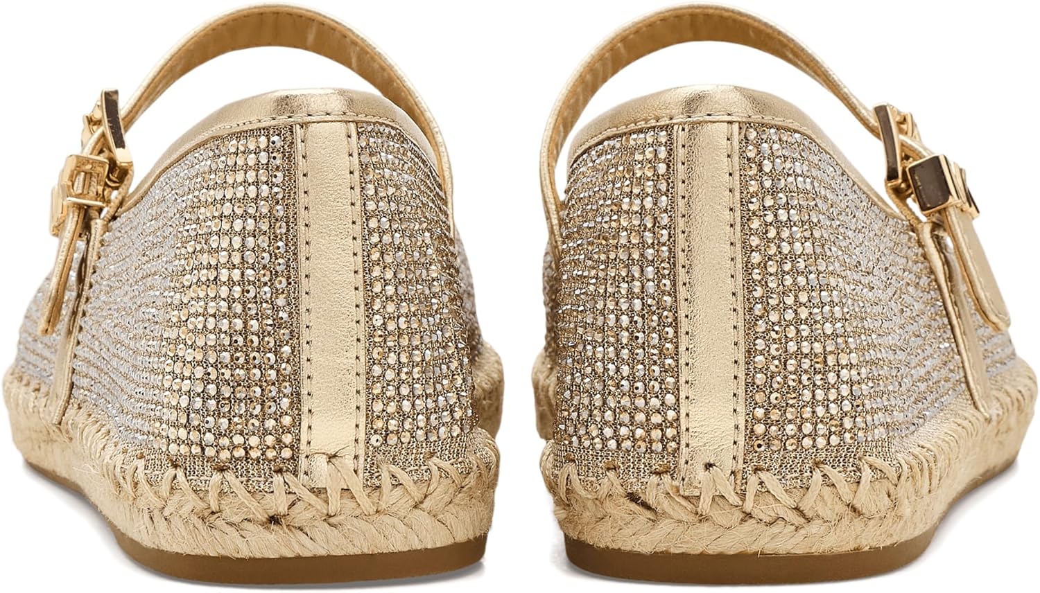 Fashionable Mary Jane closed toe espadrille flat with “MK” initial buckle keeper and MK repeat design rubber sole.