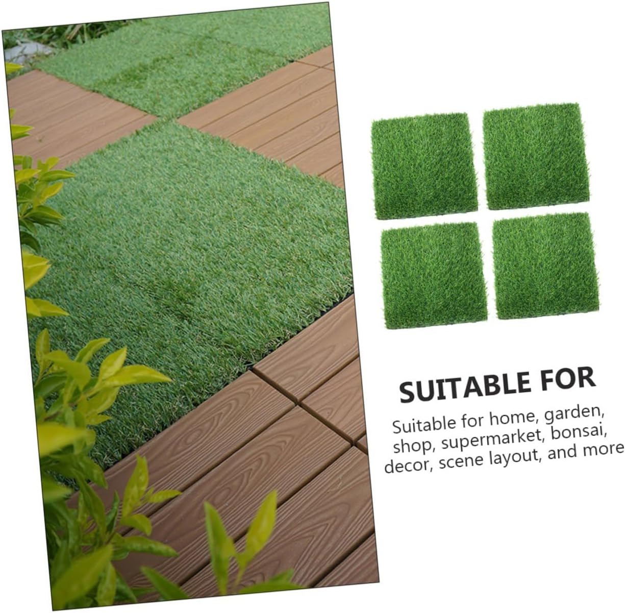Package Include 4 x Artificial Turfs Characteristics -Product Info:Simulated lawn -Color:Green -Material:Plastic -Size:30.00X30.00X3.50cm/11.79X11.79X1.38in - It can be used to decorate your garden or house. It stays vivid and bright anywhere and resists harsh sunlight artificial grass turf. - Can be used as a decoration for garden, room, modeling landscape, balcony, restaurant and so on grass rug. - The fake grass s mat looks real and can bring green life and freshness to your living space artificial grass rug. - The simulation grass mat decor is made of plastic material, safe to use, a lifelike decor for your home. - No need for daily maintenance, easy and convenient to enjoy the natural beauty artificial grass mat.Goods Informationoutdoor dog grass pad These artificial grass turfs are designed with natural grass's color, which is more beautiful and delicate.fake grass rug If you want to make your room full of green, then you miss our artificial grass mat.grass landscape of plastic material, it is practical