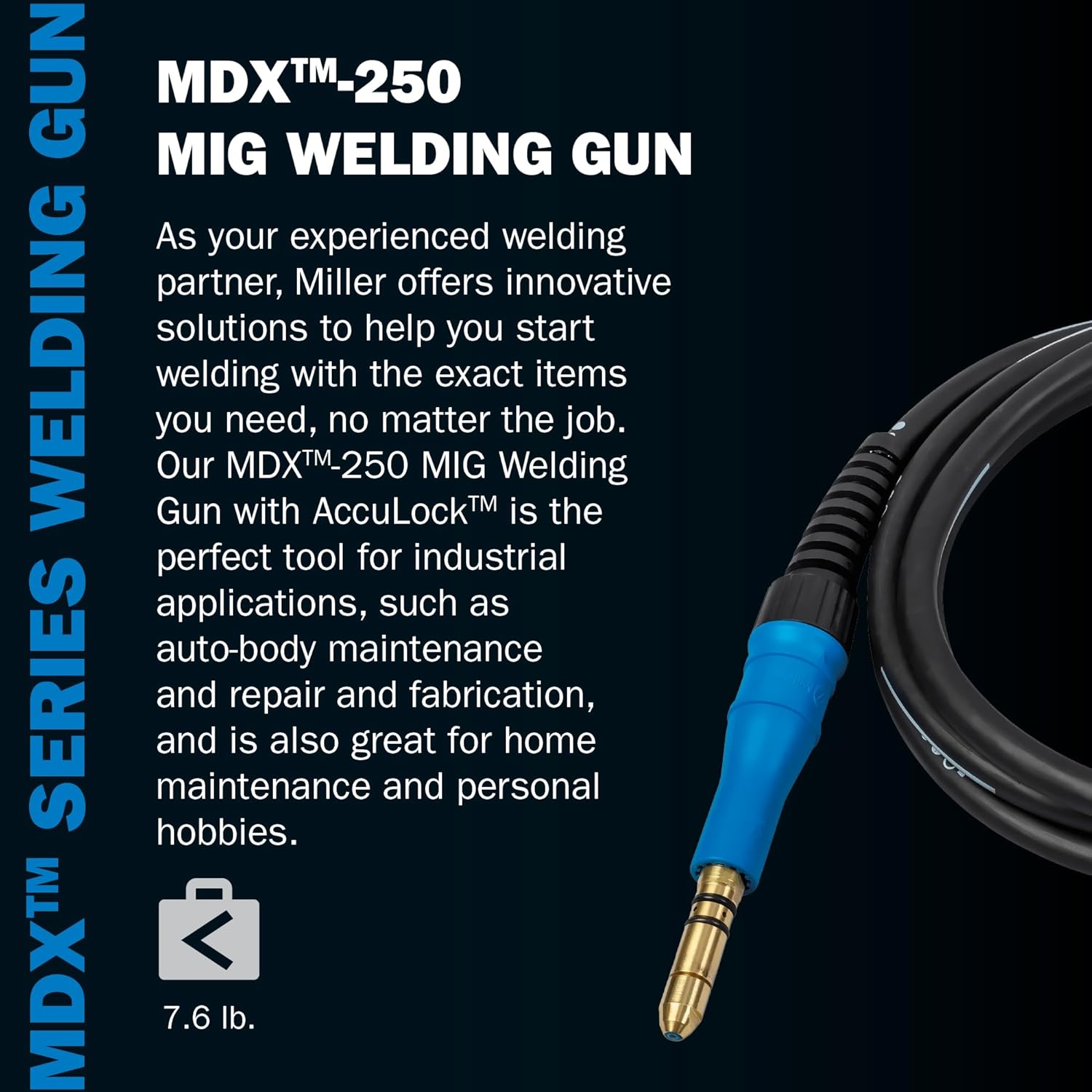 Forge Your Path To Welding Excellence with Miller Power up your welding projects with Miller MDX-250 MIG Welding Gun. It features a 250A-rated output powerhouse that takes welding to a whole new level. With its special rubber over-molding, you can experience comfortable welding sessions and improved grip. This helps lessen welder fatigue so you can easily focus on your craft for hours. Our MIG weld gun aims to provide you with reliable performance, simplified maintenance, and great comfort. Experience the epitome of wire-feeding excellence with our MIG welder gun's front-loading AccuLock liner. Its locked and concentrically aligned design reduces downtime and troubleshooting, giving you uninterrupted welding precision. Avoid weld quality issues caused by improperly trimmed liners with our welder gun's error-proof liner trimming. It works to simplify welder training and helps ensure top-notch welds as you work. Engineered to handle both CV and pulse waveforms, our MIG torch promotes reliable performance with every arc. Its reinforced gun cable with increased copper is designed for maximum welding efficiency for easier pulse welding tasks. Accuracy and durability come standard with our Miller MIG gun. With fewer parts, you get more accuracy, making welding a seamless experience. Stock a single line of consumables that can be shared across different Miller MIG guns, reducing inventory and eliminating replacement errors. Plus, our long-life consumables with maximized electrical conductivity and lower heat ensure lasting performance, created for tough welding jobs. Gear up for welding success with the Miller MDX™-250 MIG Welding Gun! It's ready to tackle any task with its optimized wire-feed path and 15 feet long cable. Experience welding freedom with the ball-and-socket rear swivel, providing you with a free range of motion. Weld with confidence, knowing that our MIG gun has got your back. Get yours now!