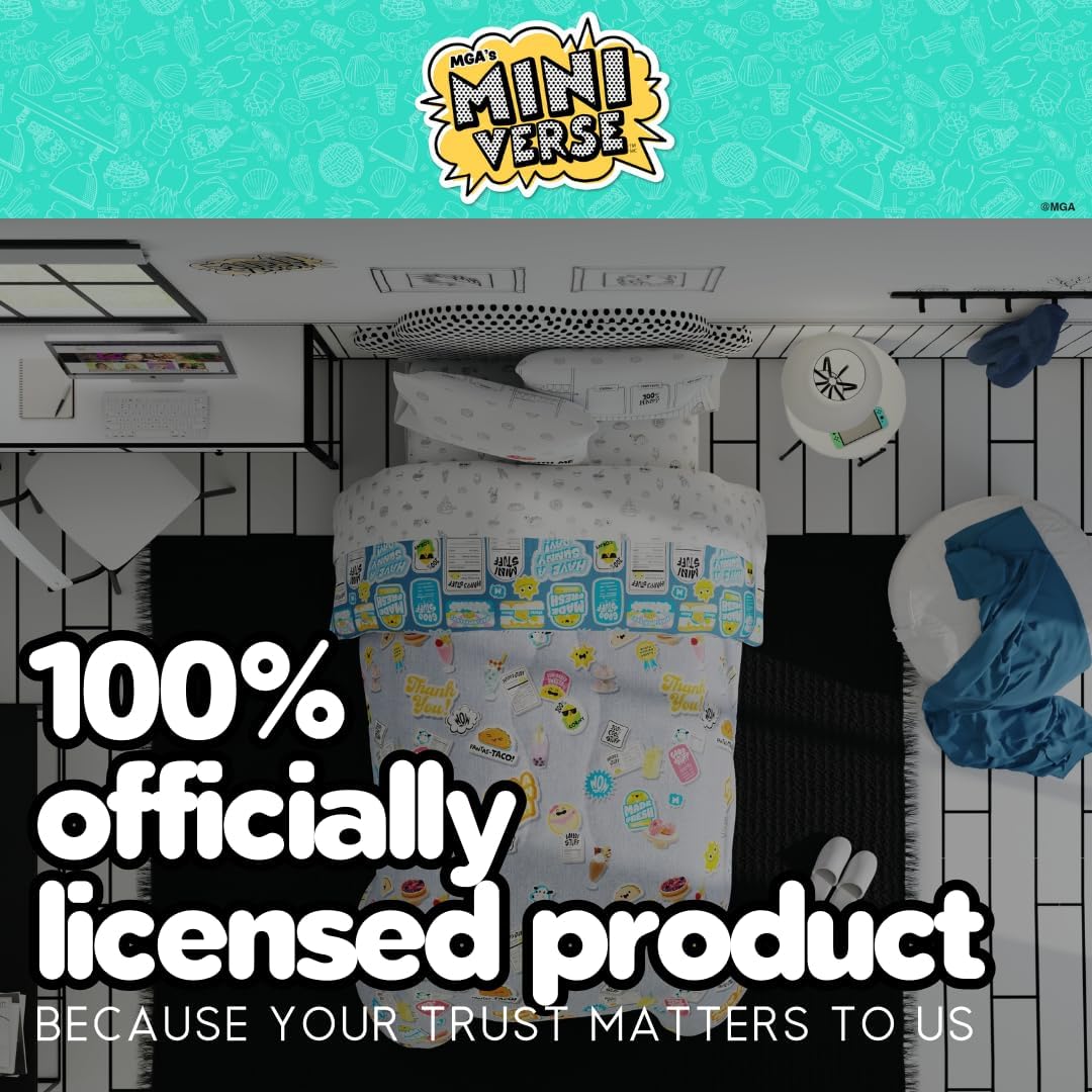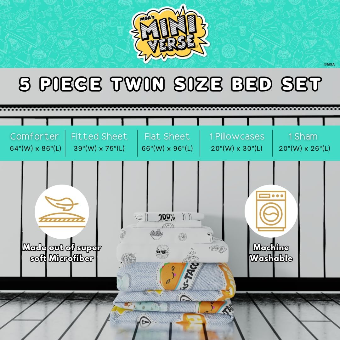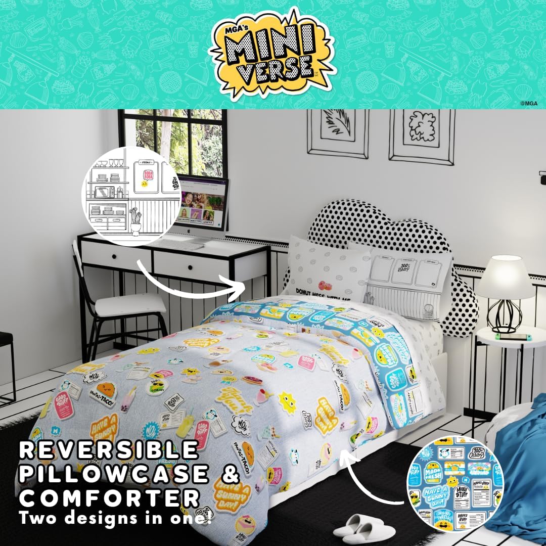 Transform your child’s room into a donut delight with this super fun Miniverse Donut bed set! Perfect for donut lovers, this officially licensed set includes a reversible comforter, twin or full sheet set, and pillowcase(s) for a complete bed makeover. One side of the comforter features colorful donuts and playful food icons that add a sweet pop of color, while the reverse side showcases fun, inspiring phrases like “Have a Sunny Day” and “Good Stuff” on a blue backdrop. Made from ultra-soft, cozy fabric, this bedding set ensures comfort all night long and is machine washable for easy care, keeping it fresh and soft. With a fitted sheet, flat sheet, and pillowcase(s) covered in a whimsical donut pattern, every piece of this bed set contributes to a vibrant, playful look. This Miniverse Donut bed set not only brightens up any bedroom but also makes bedtime a deliciously fun experience. Ideal for young dreamers with a love for sweet treats and colorful decor!
