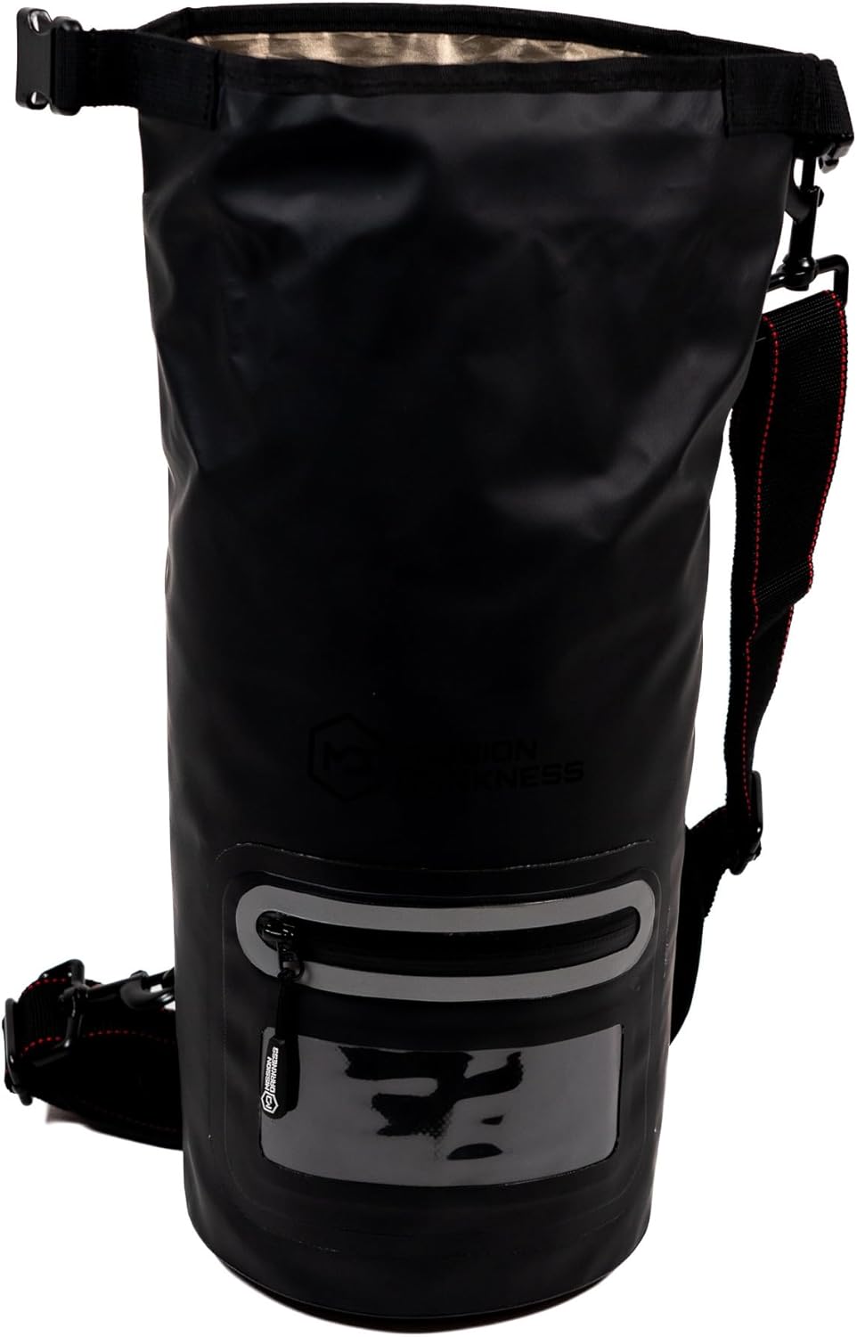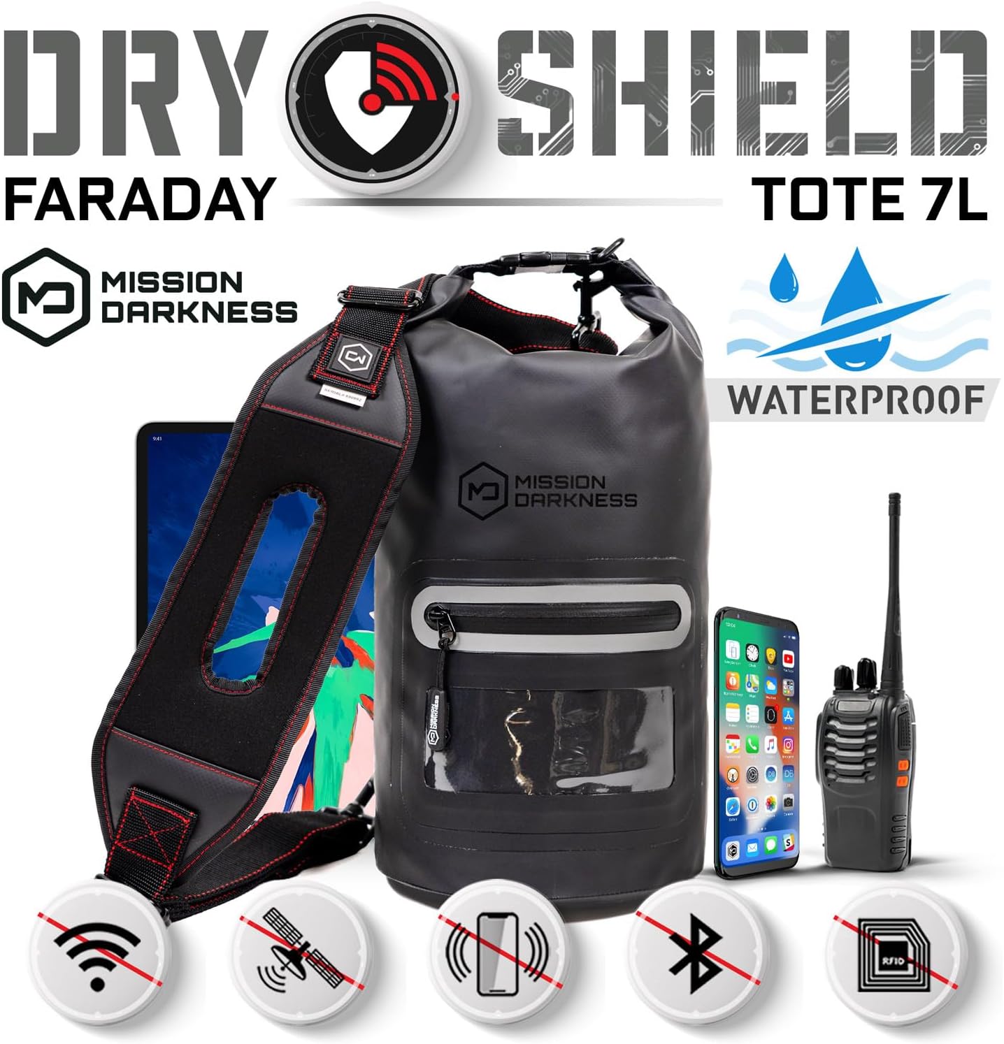 The Mission Darkness Dry Shield Faraday Tote 7L completely blocks all wireless signals and keeps small to midsize electronic devices shielded to prevent hacking, tracking, spying, and chain of custody corruption. When a device is properly enclosed in the bag, no apps or malicious code can be remotely triggered or wiped, no communication can penetrate, and no one can access the microphone, camera, GPS location, or data. Primary uses are for law enforcement and military forensic evidence collection, defense against data theft, personal security, EMP protection, EMF radiation reduction, and to enhance digital privacy. The bag is built with a durable and waterproof 500D PVC outer material and two layers of high-shielding TitanRF Faraday Fabric on all interior sides with dual paired seam construction. It includes an adjustable and detachable padded strap for carrying over the shoulder or attaching to structures. The interior space can easily fit multiple radios, cell phones, tablets, and accessories. A waterproof unshielded zipper pocket on the outside allows you to keep frequently used small items or devices (like cell phones) accessible and online when needed, and also doubles as an agency branding compartment. Electronics enclosed inside are guaranteed to remain dry and offline in any water-surrounded location.