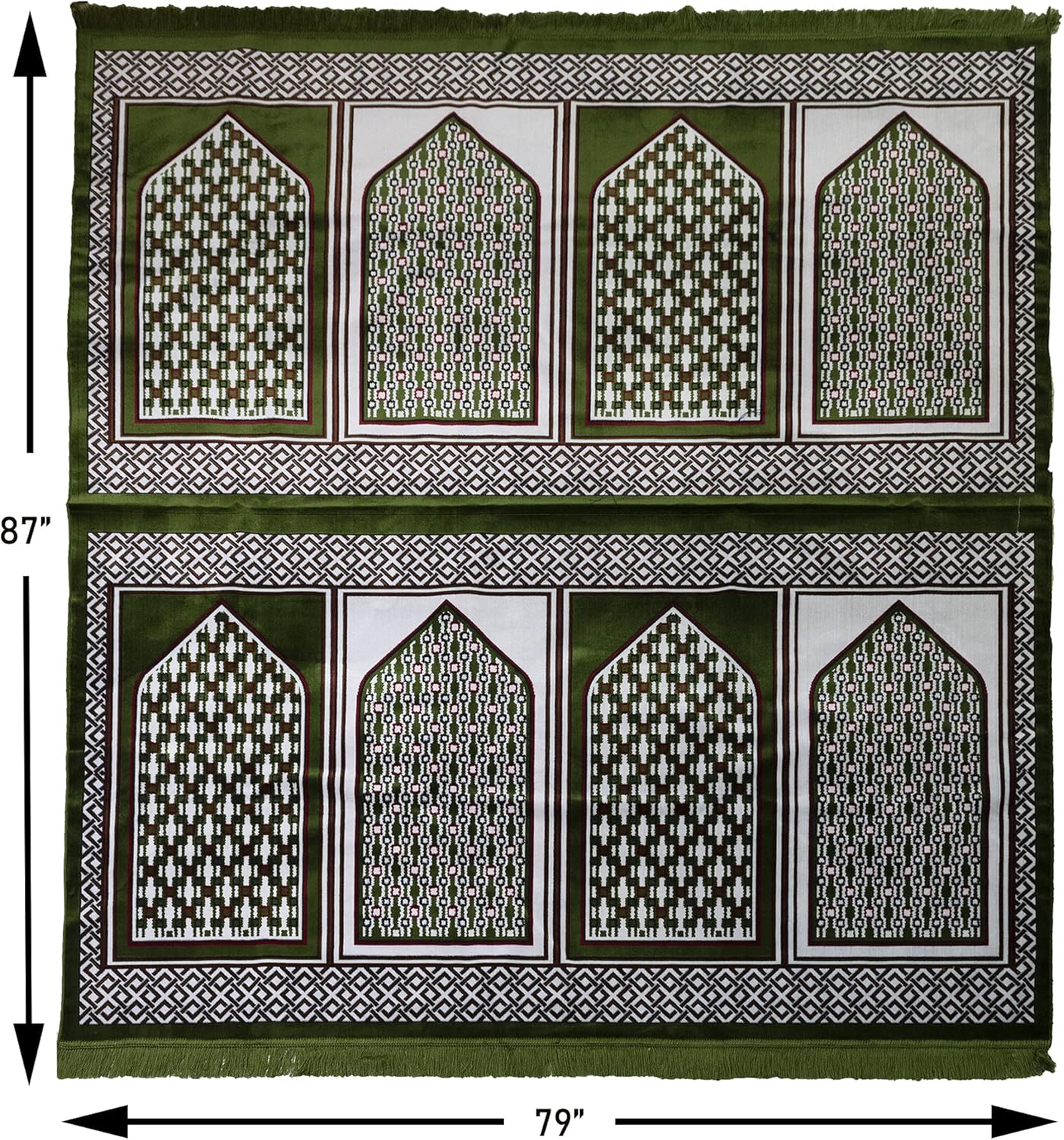 Modefa Islamic Prayer Rug ---> Looking for a sajjadah perfect for large gatherings? You've found it! Our multi person Muslim prayer rugs are great for families or groups! Made out of plush velvet and available in a wide variety of sizes and designs! Amazing plush praying rug that makes for a good Muslim gifts for men for any special occasion! Also great Islamic gifts for women! Why We Love It ---> What an incredible large prayer rug! Featuring an intricate geometric arch pattern all across, this gorgeous piece is truly one of a kind! Combine that with its wide multi person design and unique color, and you've got a janamaz that is sure to wow. Wide rug can be comfortably used by 8 people! Available in several beautiful colors and is the perfect Islamic gift or Eid gift or Ramadan gifts! Thickness Scale ---> 6/10: Our Modefa Thickness Rating on this Turkish prayer carpet is a 6 out of 10. This means it is a standard thickness plush prayer rug. Great Muslim rug and namaz carpet for daily salah prayers for Muslims. Every Muslim needs a good quality janamaz prayers rug to perform the prayers as prescribed in Islam. Turkish prayer rug make for great Ramadan gifts for women and men! Quality You Can Feel ---> Our prayer rugs are made in Turkey, so you know it is quality you can trust! For centuries, Turkey has been a renowned producer of Islamic prayer rugs. You can rest easy knowing you pray namaz on a prayer mat that has been ethically produced in Turkish factories -- by Muslims, for Muslims. Specifications ---> Size: 6.5ft x 7.2ft (200cm x 220cm) | Material: Velvet | Care: Hand wash, line dry for best results. May be washed on gentle cycle, cold, in a washing machine, but be aware that the tassels may come loose. We do not recommend regular washing. | Weight: 7lbs